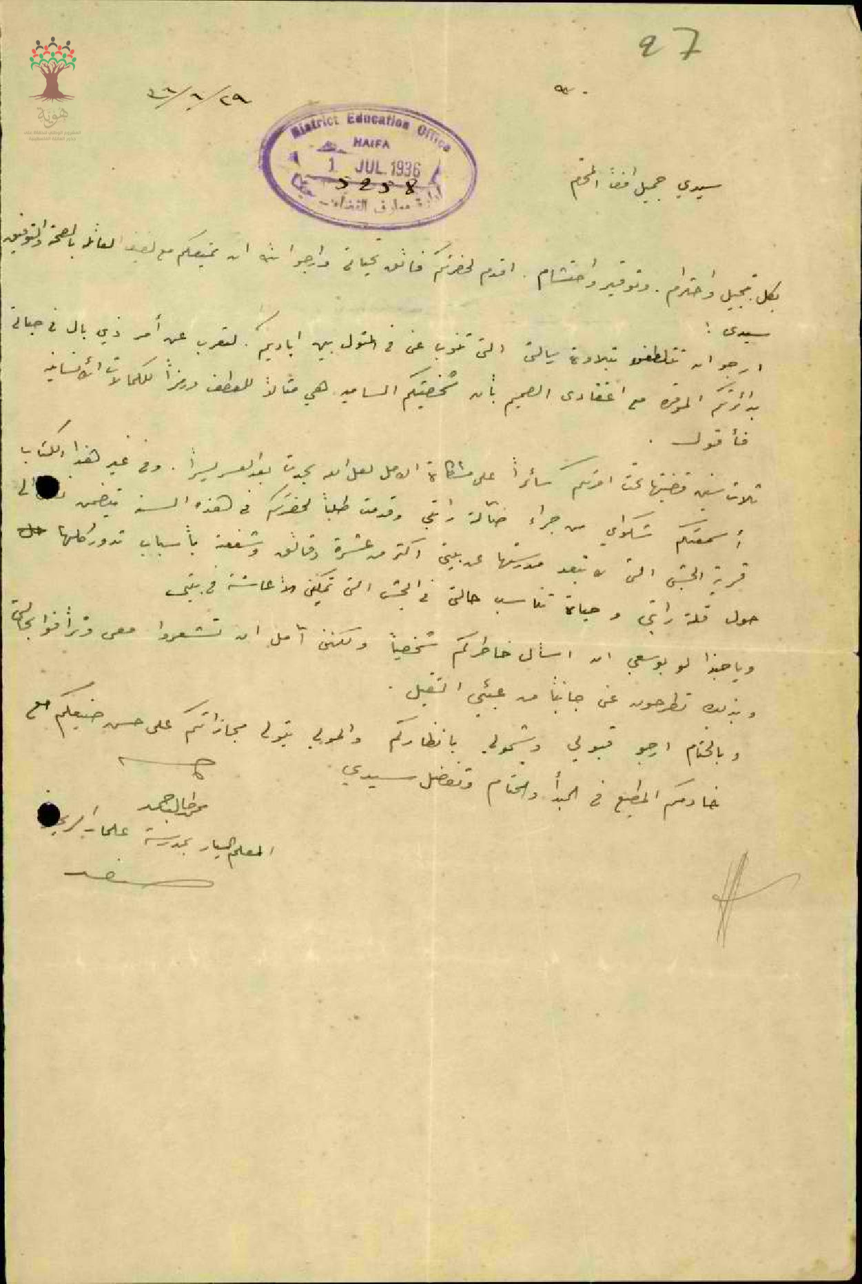 رسالة من المعلم محمد حمد الى مفتش المعارف يطلب فيها زيادة راتبه