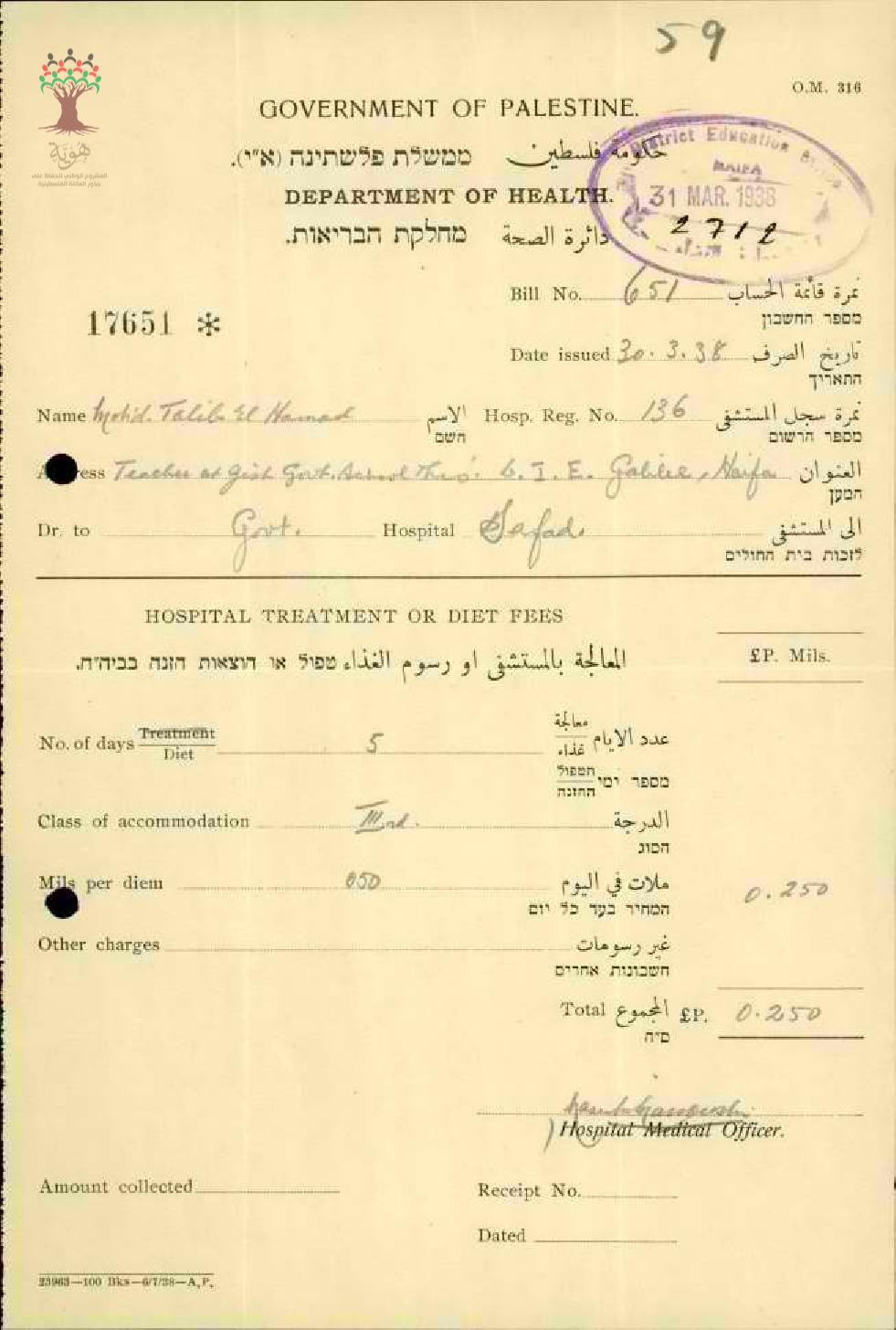 ورقة بتكاليف المستشفى التي اقام بها المعلم محمد حمد خلال فترة مرضه
