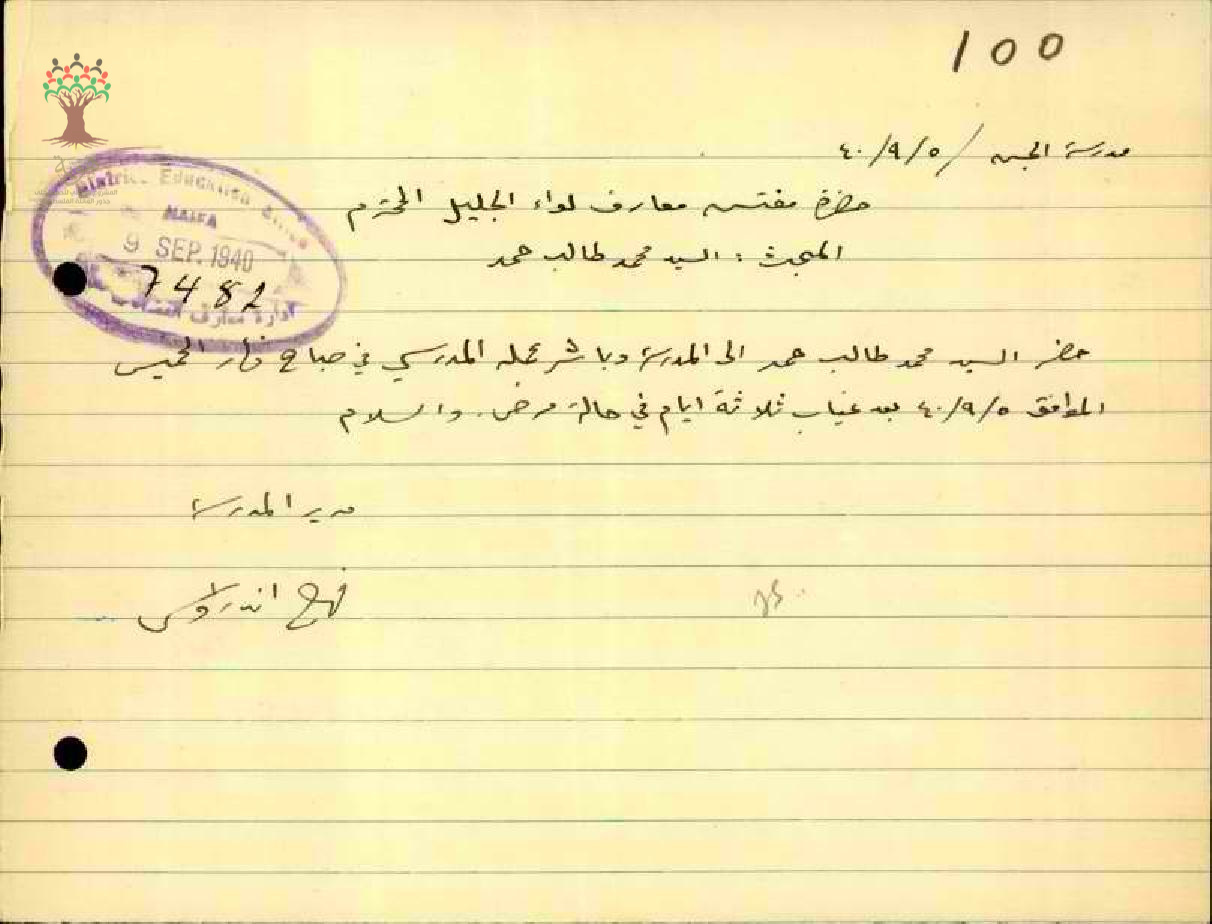رسالة من مدير مدرسة الجش الى مفتش المعارف بخصوص عودة المعلم محمد حمد الى العمل