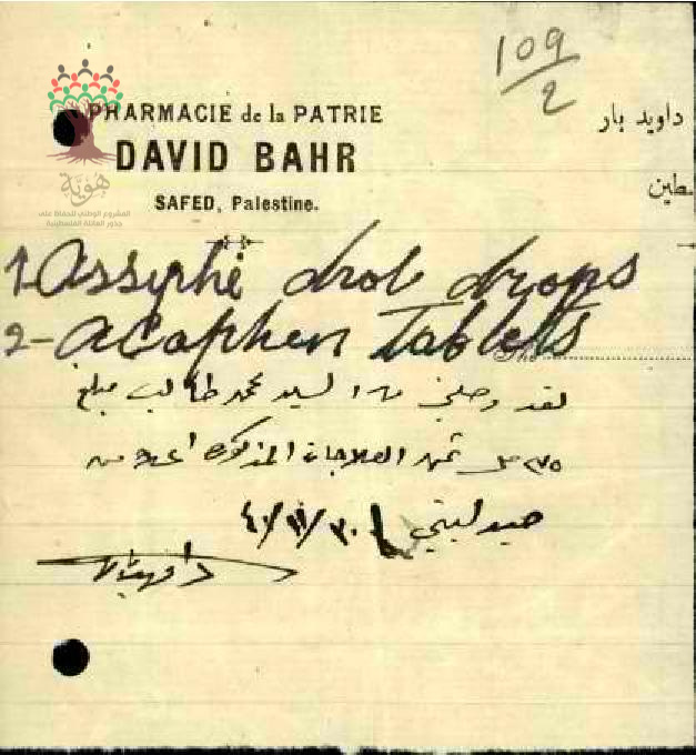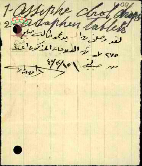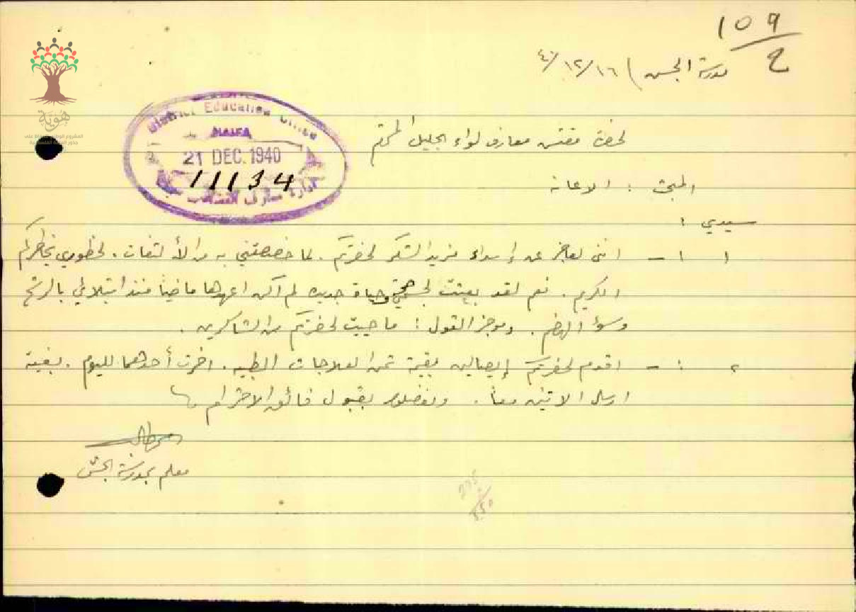 رسالة من المعلم محمد حمد الى مفتش المعارف مرفقة بايصالين ثمن العلاجات الطبية