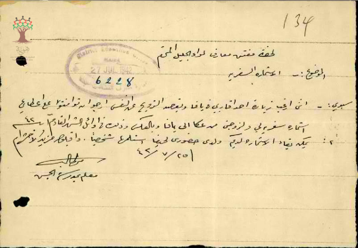 رسالة من المعلم محمد حمد الى مفتش المعارف يطلب فيها استمارة سفر الى يافا