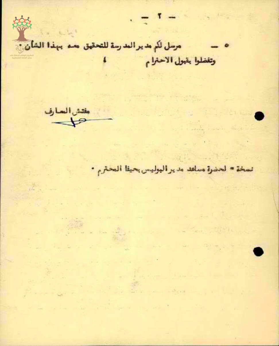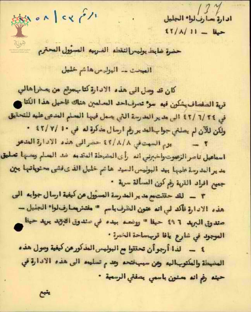 رسالة من مفتش المعارف الى ضابط بوليس النقطة الغربية بخصوص الشكوى المقدمة ضد المعلم محمد حمد
