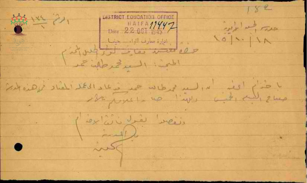 رسالة من مدير مدرسة الجش الى مفتش المعارف بخصوص عودة المعلم محمد حمد الى العمل