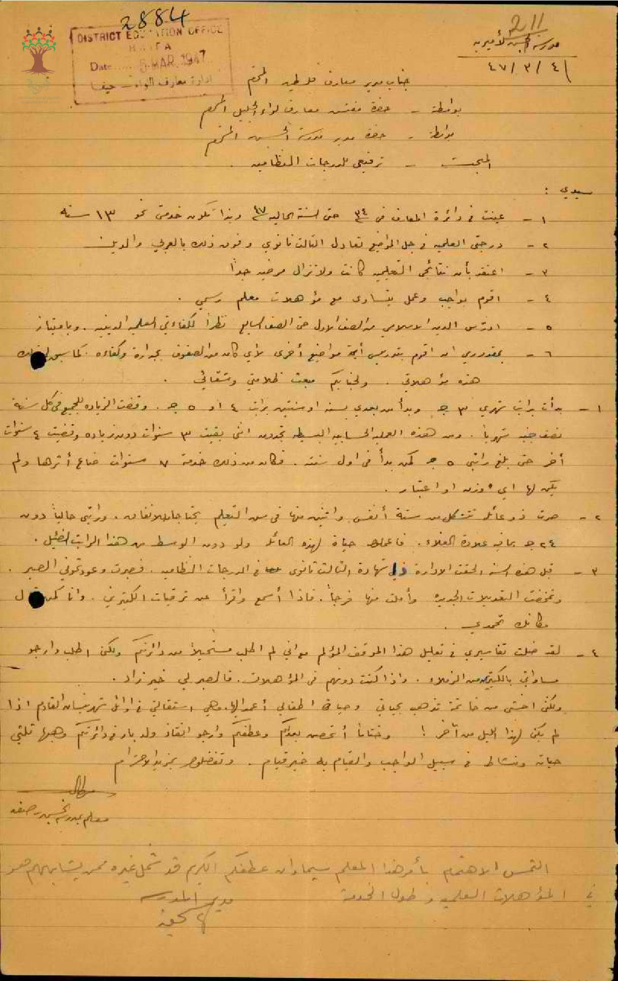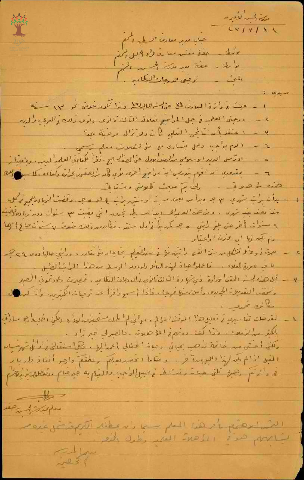 رسائل من المعلم محمد الى مفتش المعارف بخصوص حالته العامة وترفيعه الى الدرجات النظامية