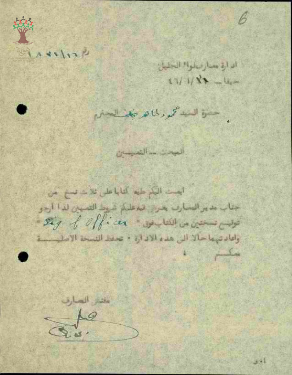 رسالة من مفتش المعارف الى المعلم محمود يخلف للتوقيع على شروط تعيينه