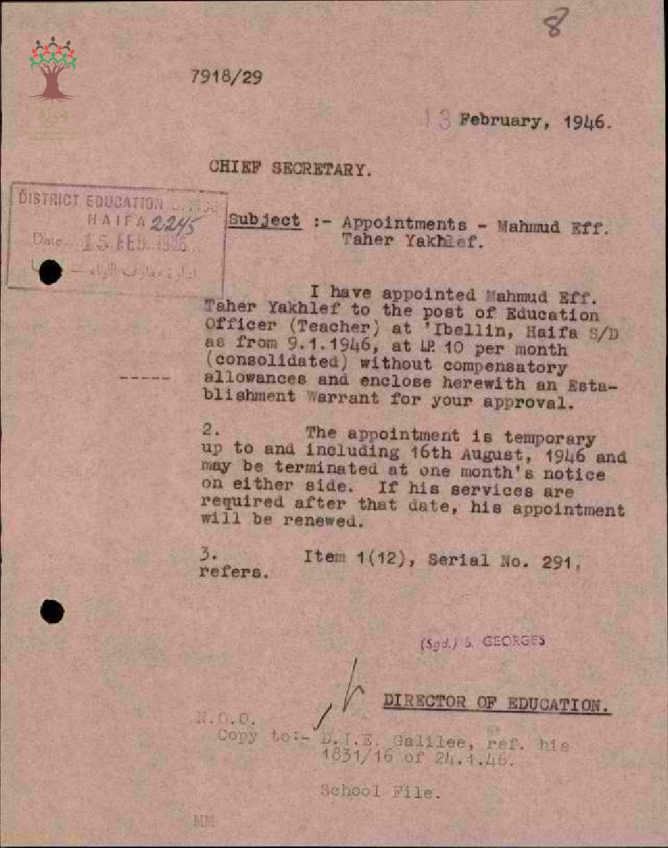 رسالة من مدير المعارف الى رئيس السكرتارية بخصوص تعيين المعلم محمود يخلف