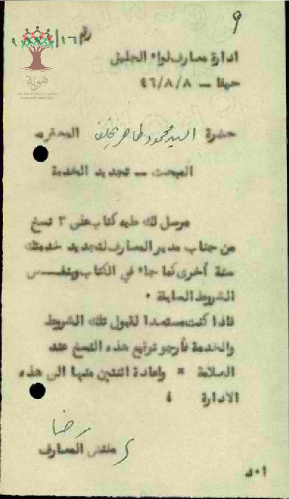 رسالة من مفتش المعارف الى المعلم محمود يخلف للتوقيع على شروط تجديد تعيينه