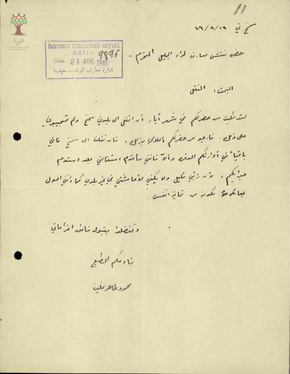 رسالة من المعلم محمود يخلف الى مفتش المعارف يطلب فيها نقله من مدرسة عبلين الى سمخ