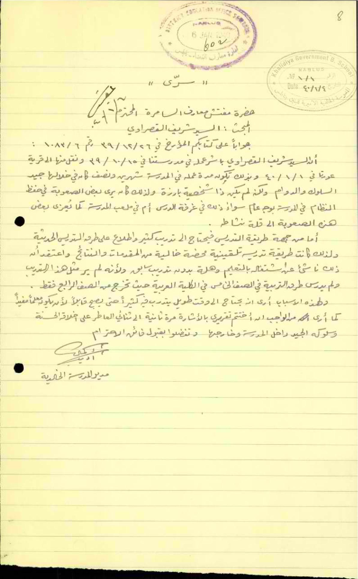 رسالة من مدير المدرسة الخالدية الى مفتش المعارف يقدم له تقرير عن أداء المعلم شريف قصراوي قبل انتقاله الى مدرسة عورتا