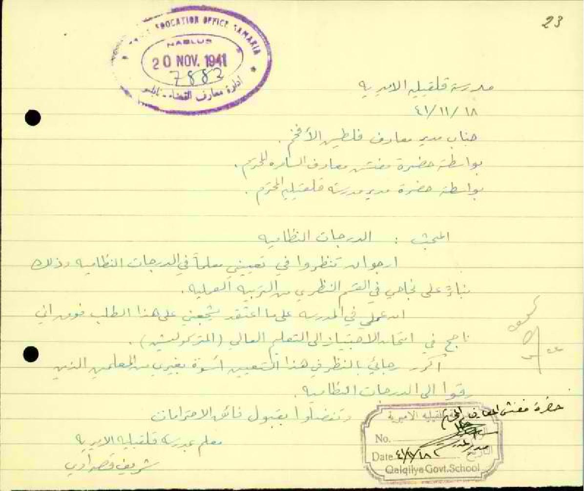 رسالة من المعلم شريف قصراوي الى مفتش المعارف بخصوص اداجه في الدرجات النظامية