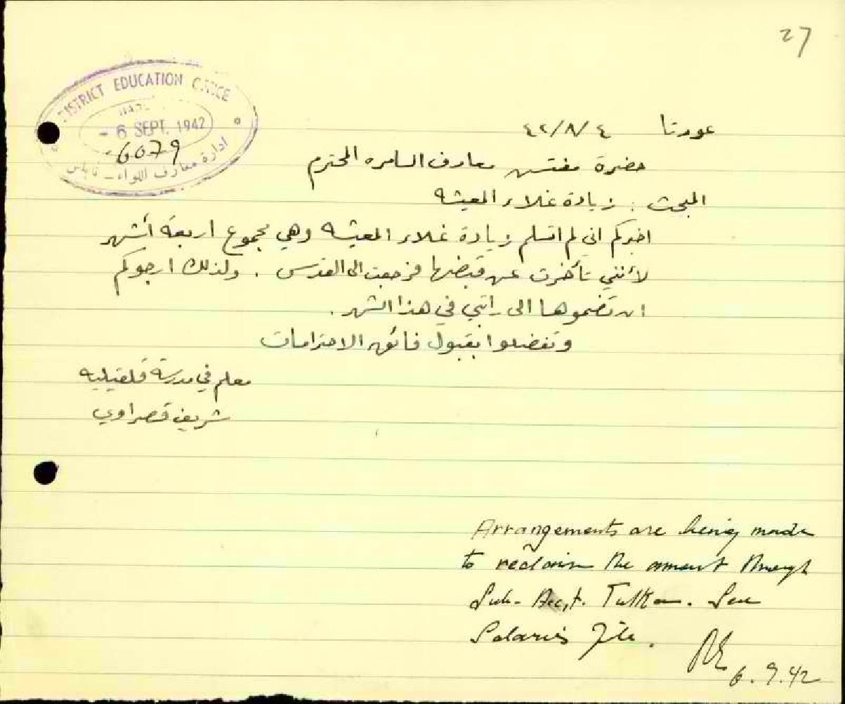 رسالة من المعلم شريف قصراوي الى مفتش المعارف يطلب فيها زيادة غلاء معيشة