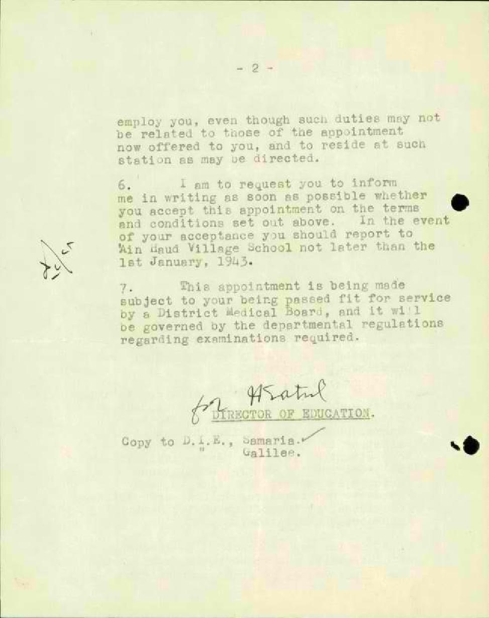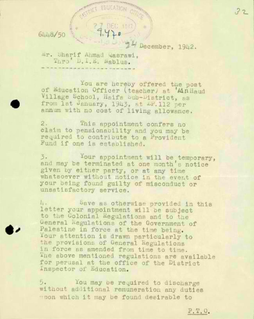 رسالة من مدير المعارف الى المعلم شريف قصراوي بخصوص نقله من مدرسة قلقيلية الى مدرسة عين حوض