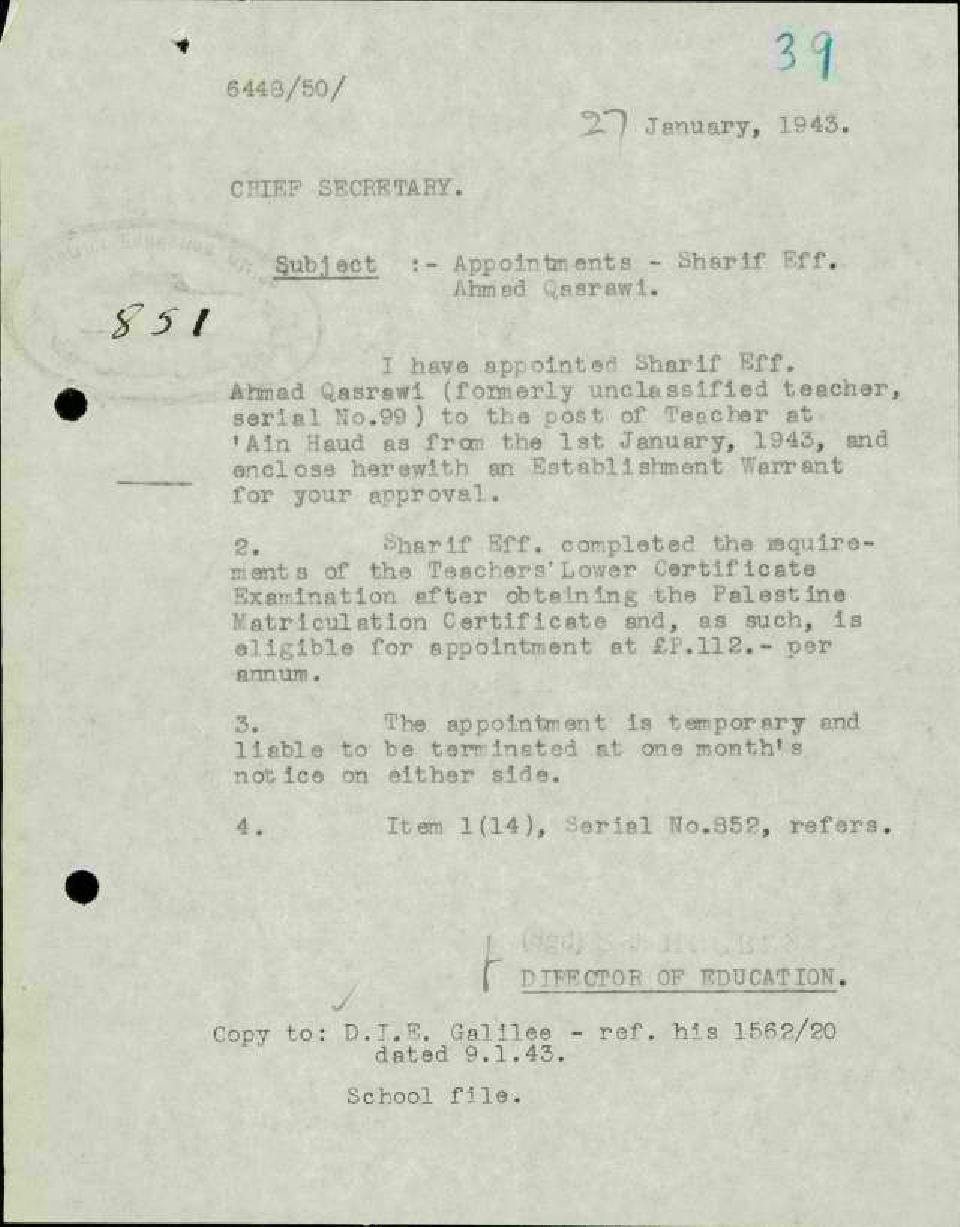 رسالة من مدير المعارف الى رئيس السكرتارية بخصوص نقل المعلم شريف قصراوي الى مدرسة عين حوض