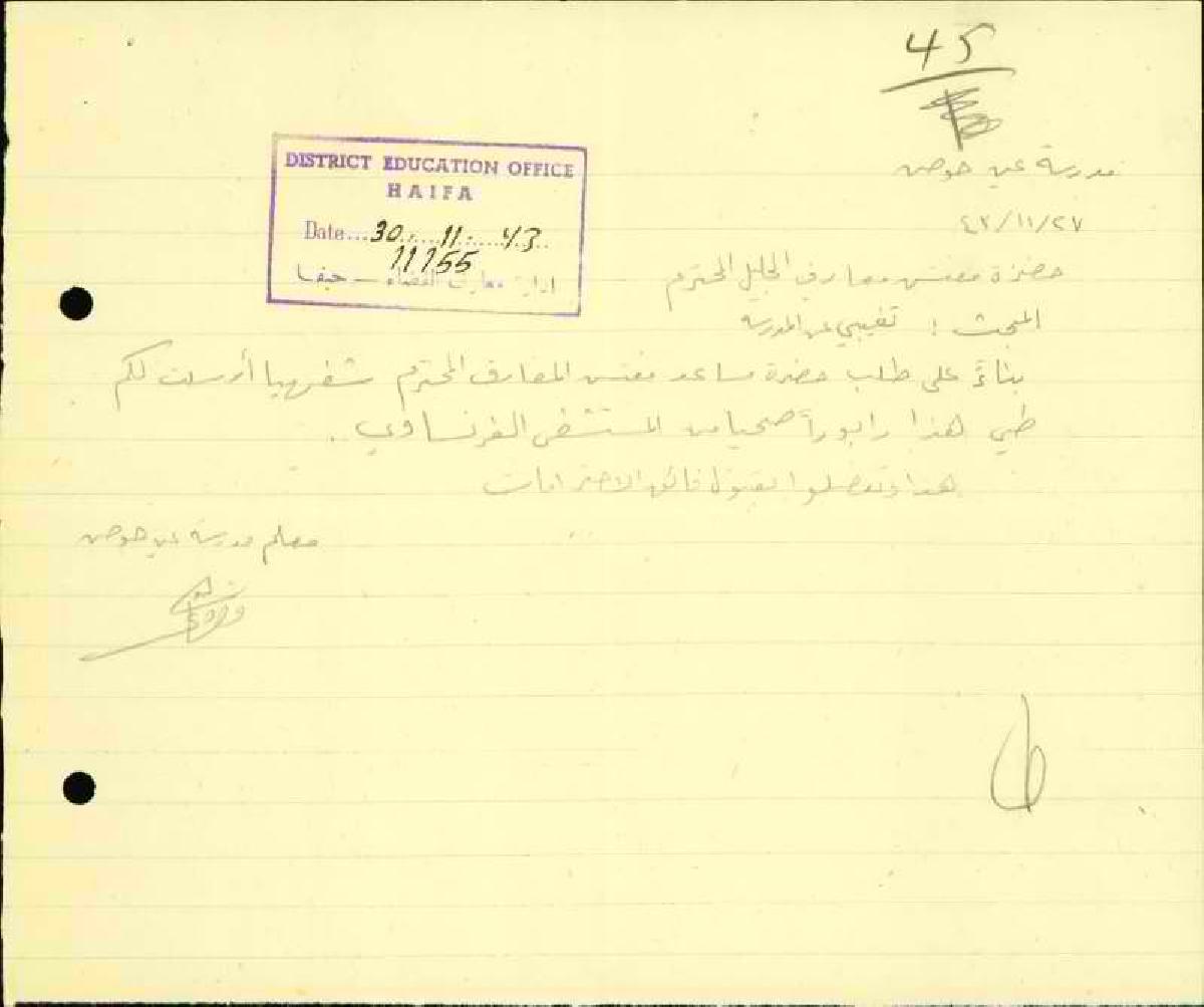 رسالة من المعلم شريف قصراوي الى مفتش المعارف بخصوص التقرير الطبي لمرض زوجته