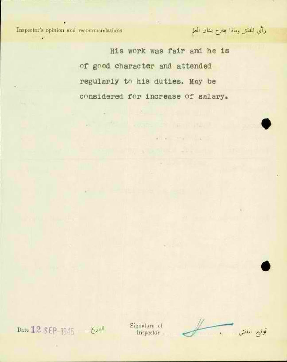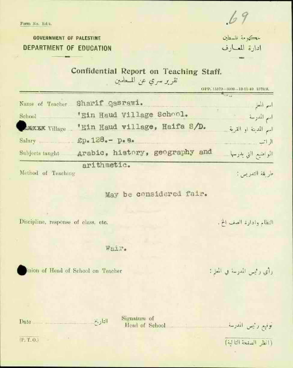 تقرير تفصيلي عن أداء المعلم شريف قصراوي في مدرسة عين حوض سنة 1945