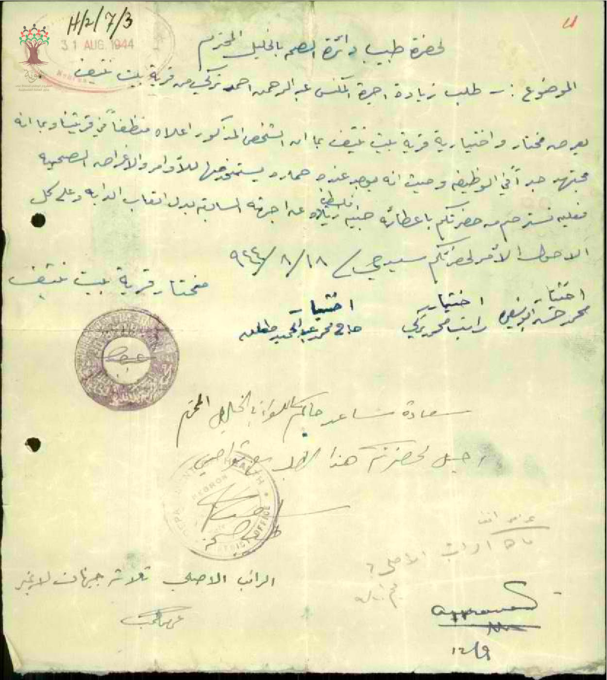 رسالة من مختار قرية بيت نتيف إلى طبيب دائرة الصحة بخصوص عبد الرحمن أحمد تركي