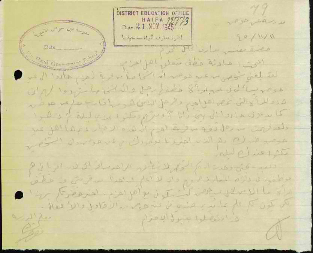 رسالة من المعلم شريف قصراوي الى مفتش المعارف بخصوص اشكال مع اهل القرية