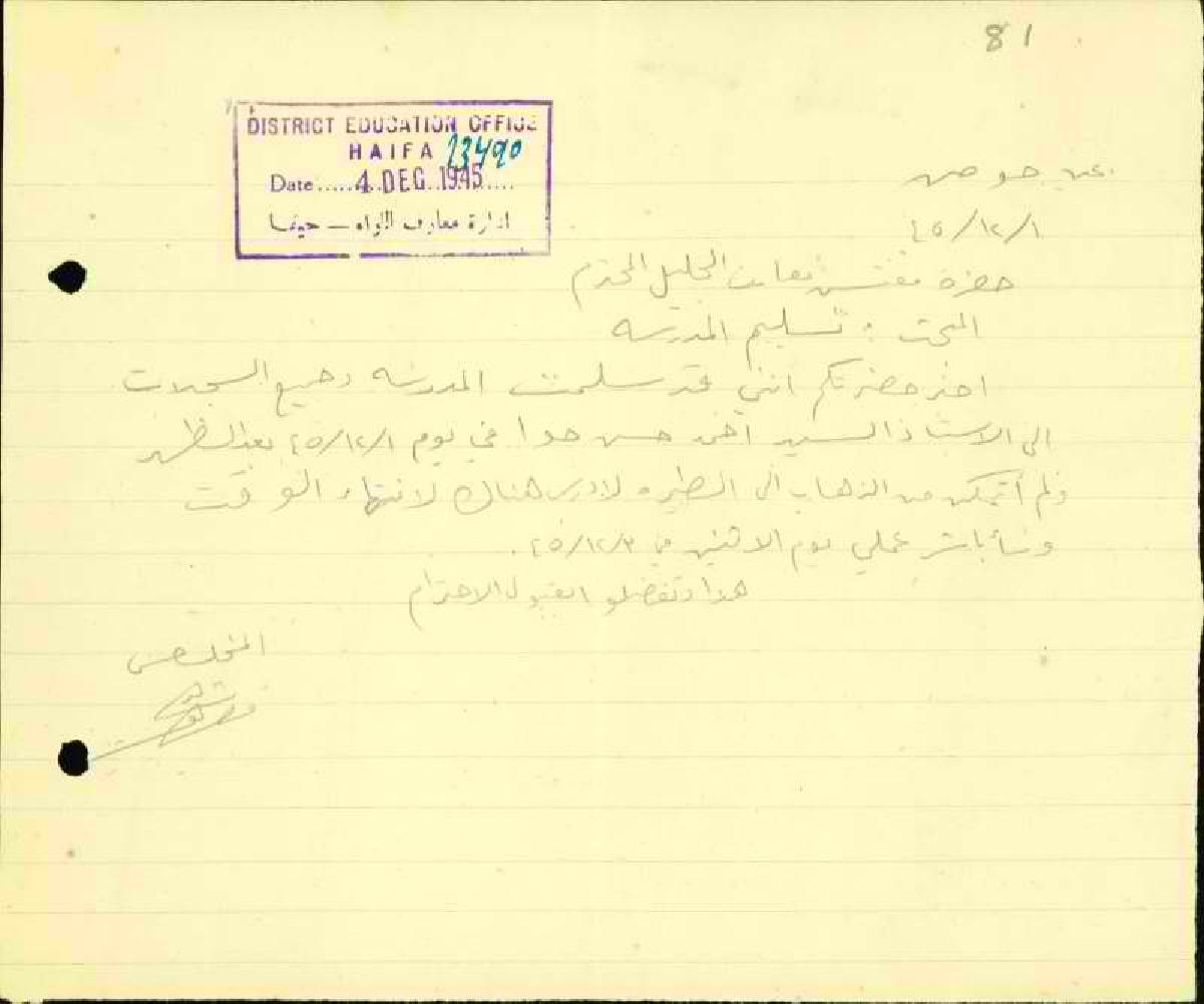 رسالة من المعلم شريف قصراوي الى مفتش المعارف يخبره بأنه قد سلم المدرسة للمعلم أحمد حوا