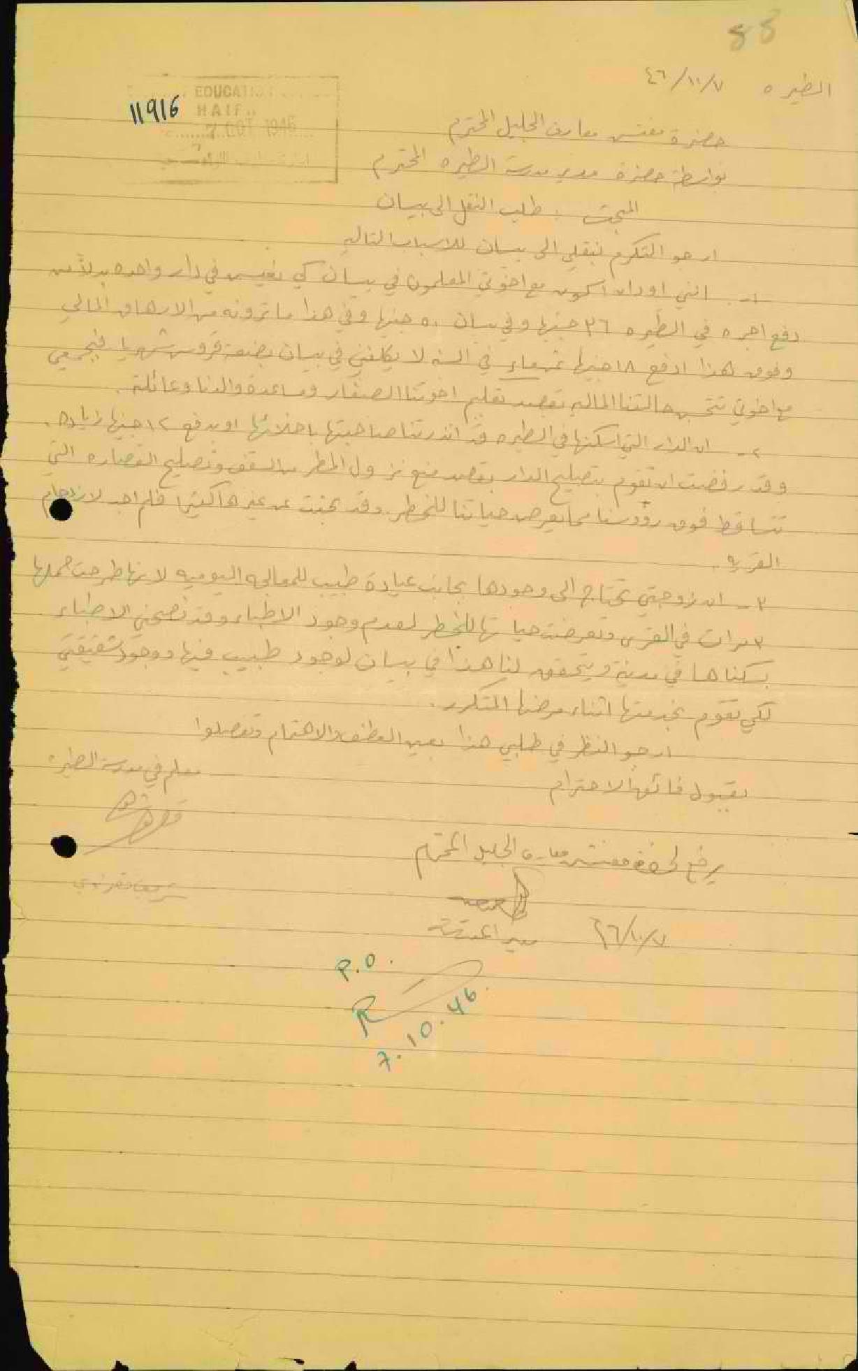 رسالة من المعلم شريف قصراوي الى مفتش المعارف يطلب فيها نقله من مدرسة الطيرة الى بيسان