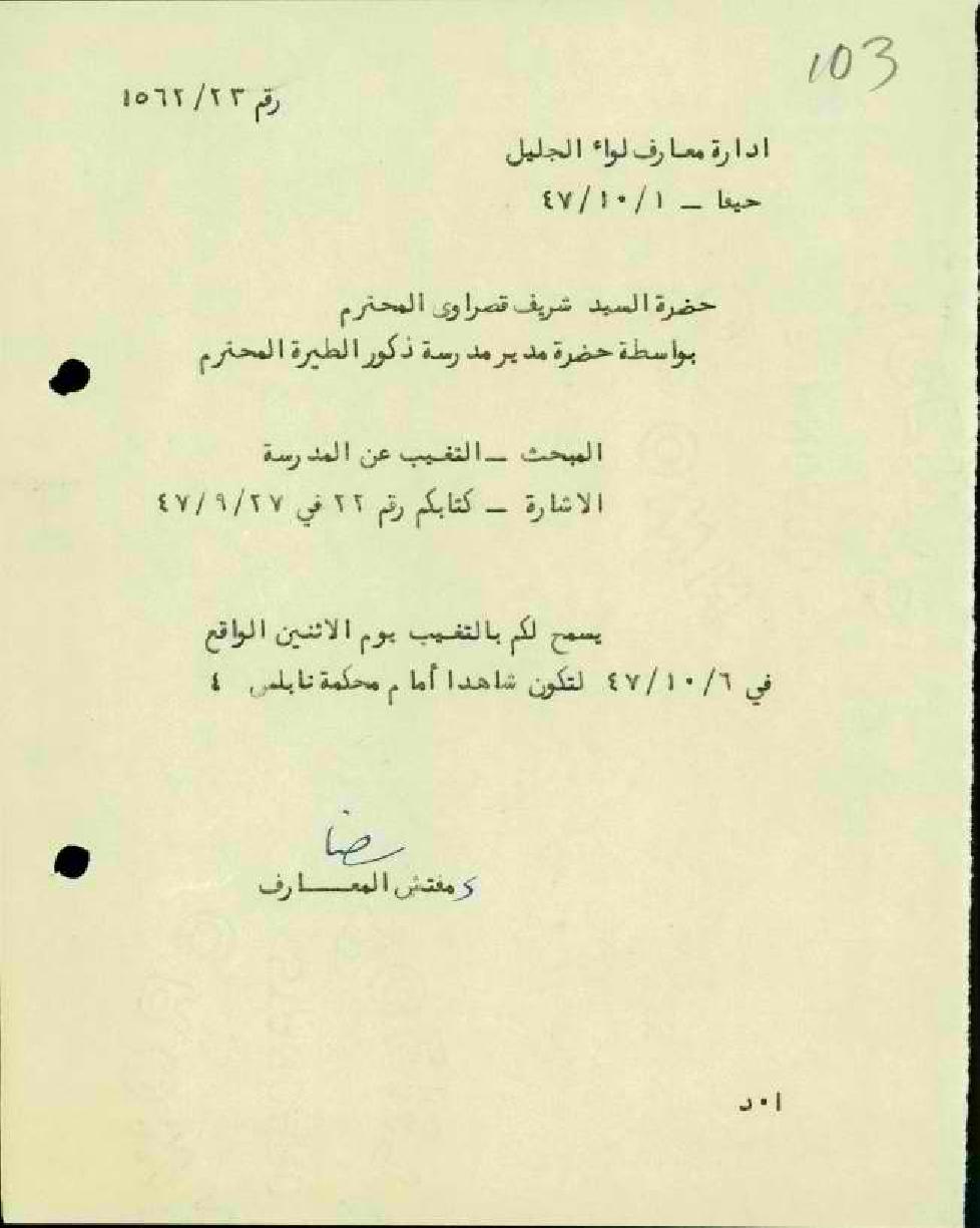 رسائل بخصوص تغيب المعلم شريف قصراوي لأداء شهادة في محكمة نابلس