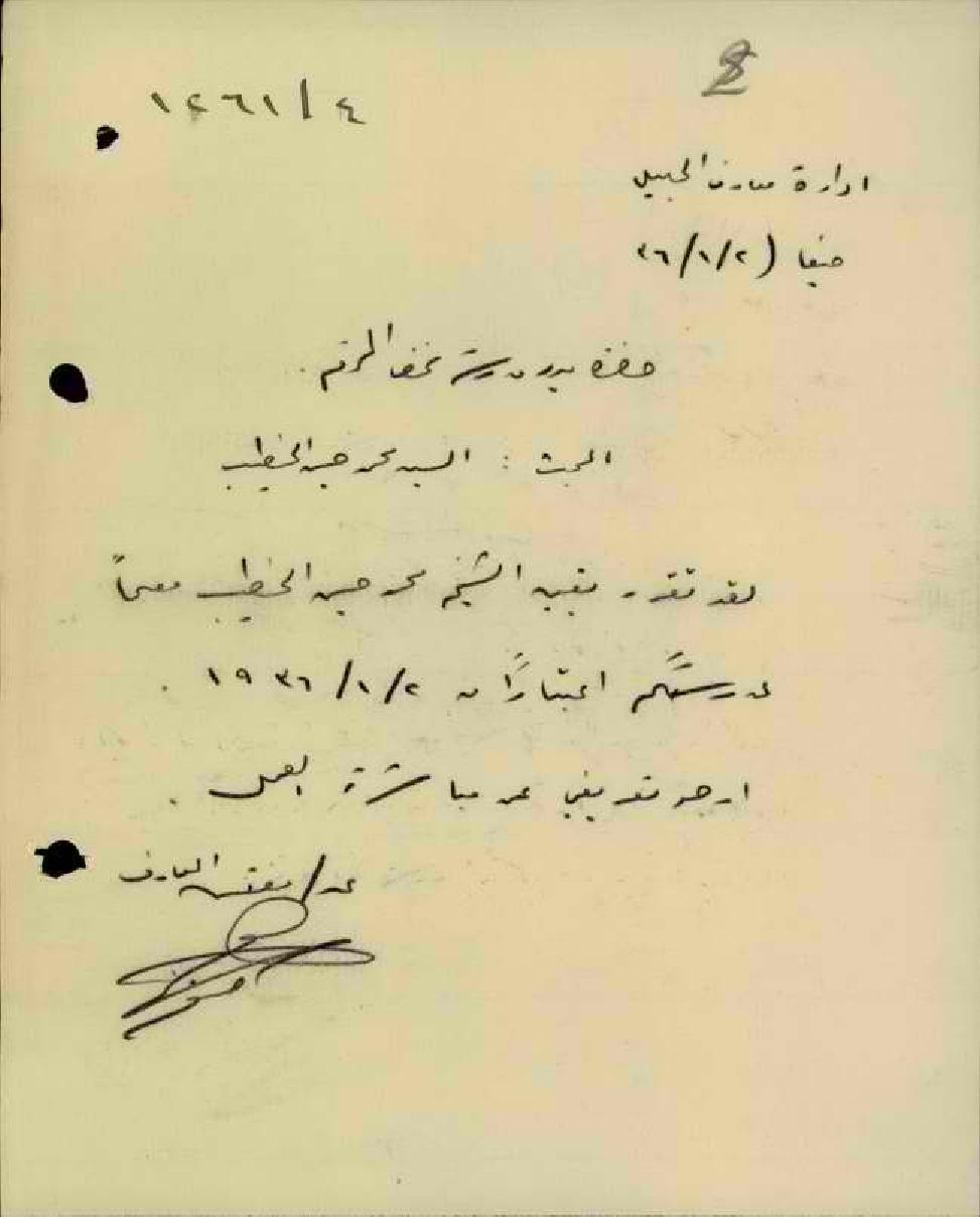 رسالة من مفتش المعارف الى مدير مدرسة نحف بخصوص تعيين المعلم محمد الخطيب في مدرسة نحف