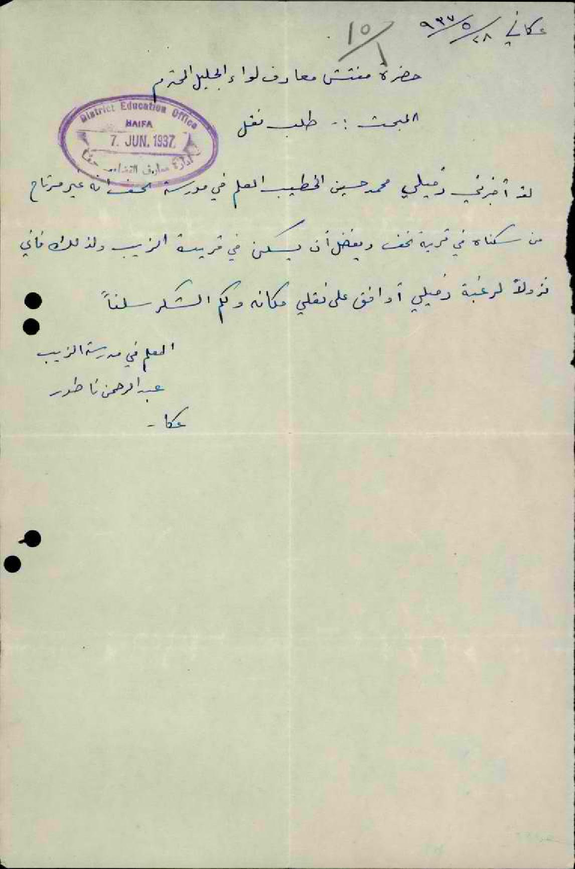 رسالة من المعلم عبد الرحمن ناطور الى مفتش المعارف يطلب تبادل المراكز مع المعلم محمد الخطيب