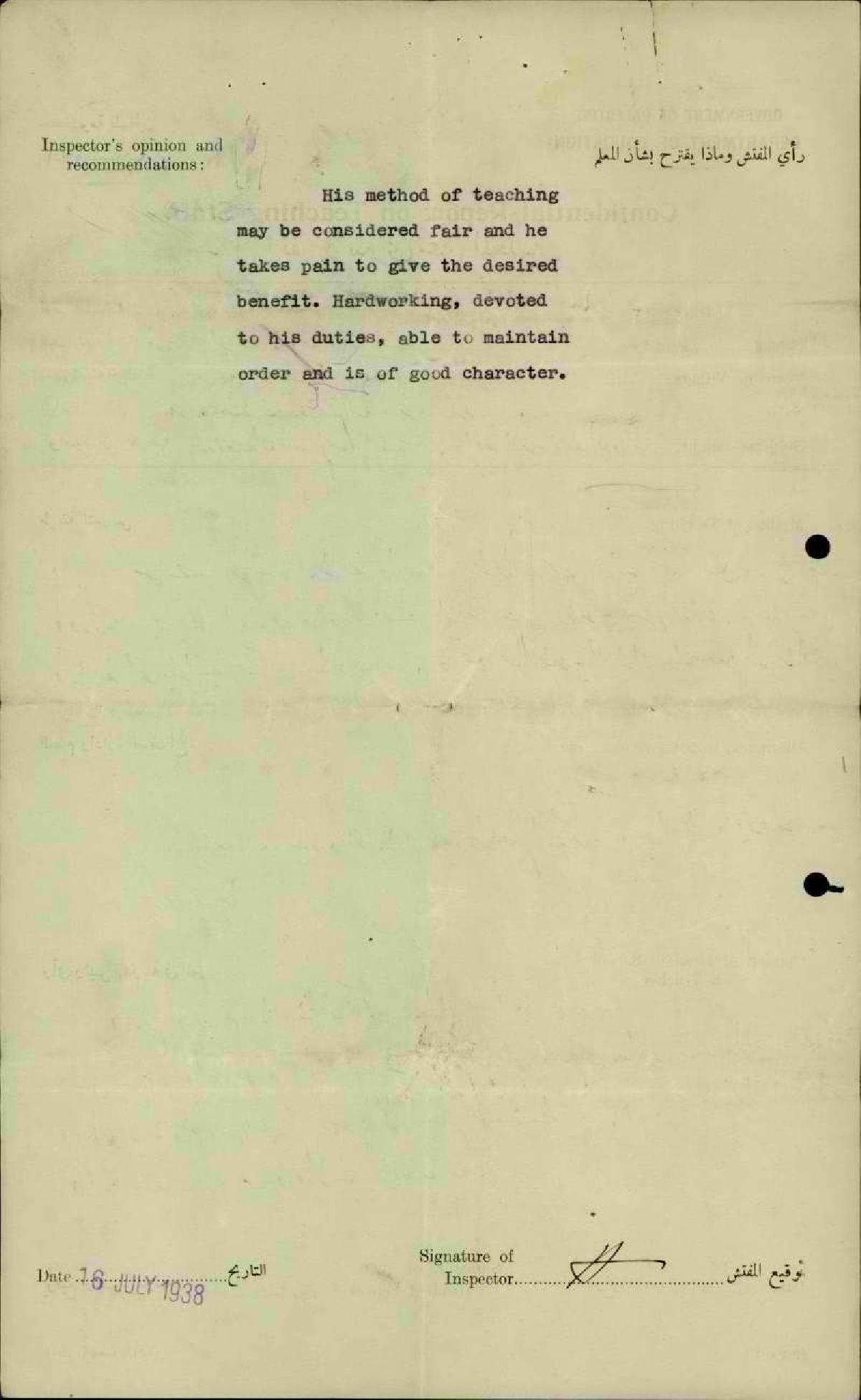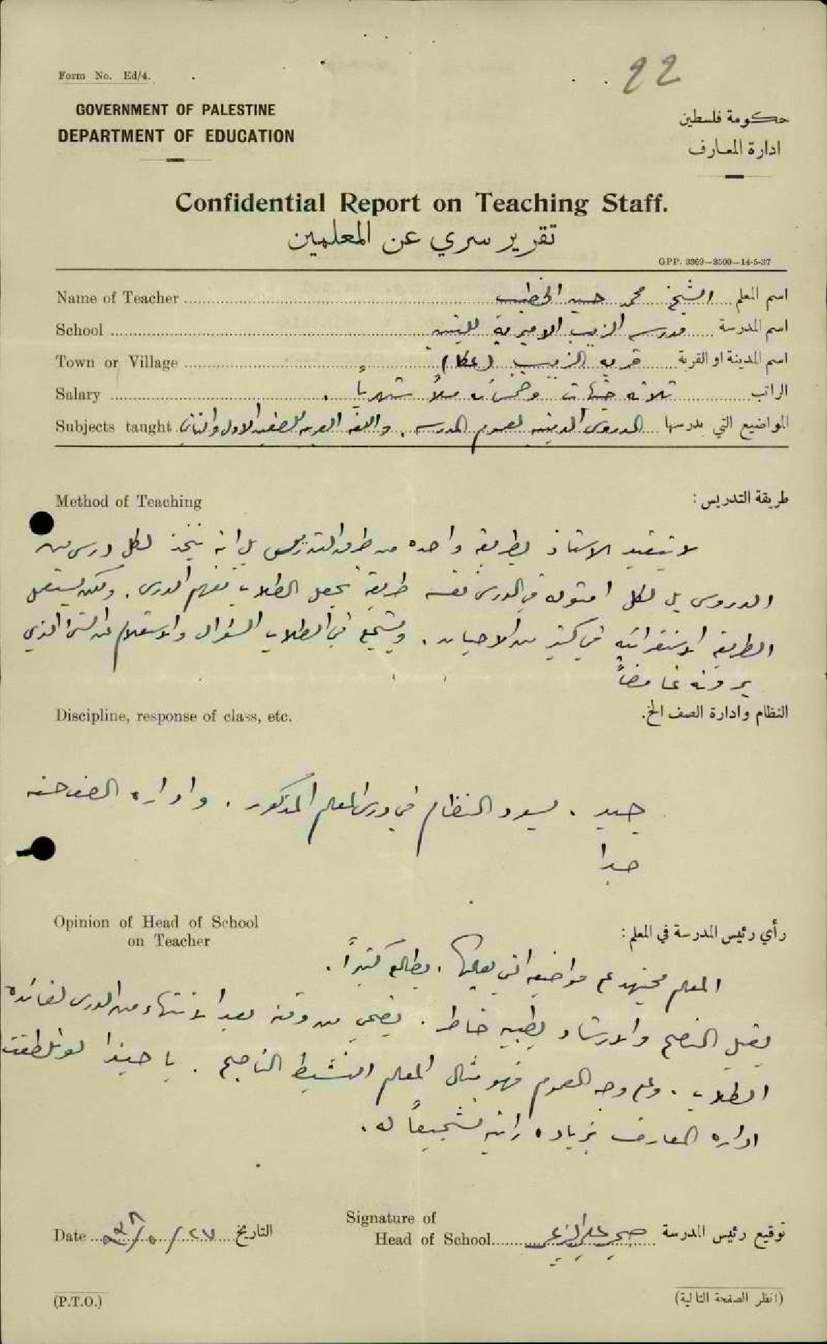 تقرير تفصيلي عن أداء المعلم محمد الخطيب في مدرسة الزيب سنة 1938