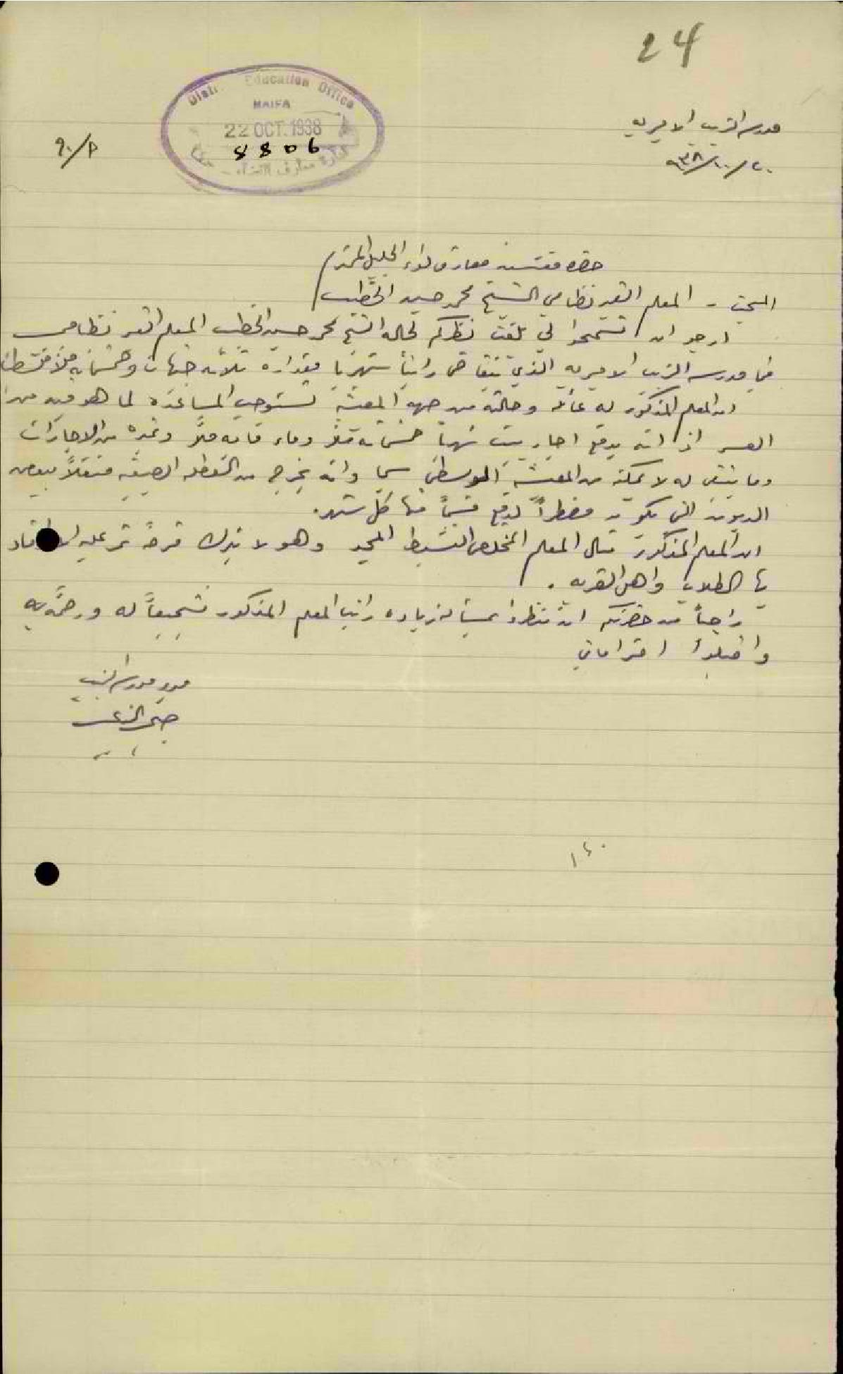 رسالة من مدير مدرسة الزيب الى مفتش المعارف يطلب فيها زيادة راتب المعلم محمد الخطيب