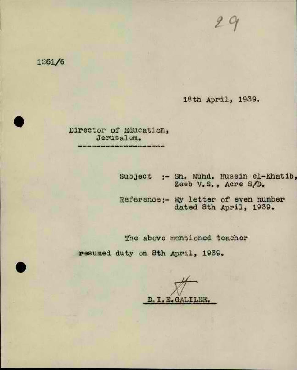رسالة من مفتش المعارف الى مدير المعارف بخصوص عودة المعلم محمد الخطيب الى العمل