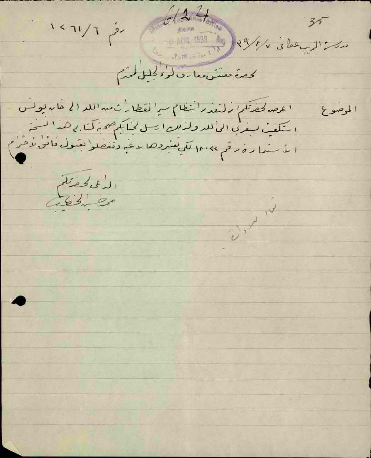 رسالة من المعلم محمد الخطيب الى مفتش المعارف بخصوص استمارة سفره