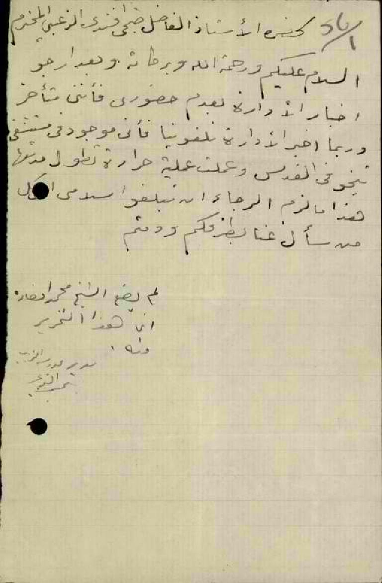 رسالة من المعلم محمد الخطيب الى مدير مدرسة الزيب يخبره بأنه سيتأخر عن العمل