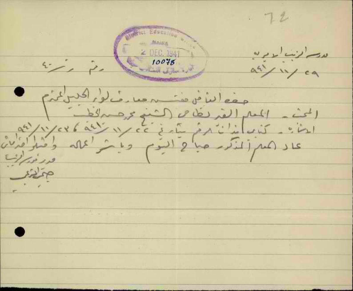 رسالة من مدير مدرسة الزيب الى مفتش المعارف بخصوص عودة المعلم محمد الخطيب الى العمل