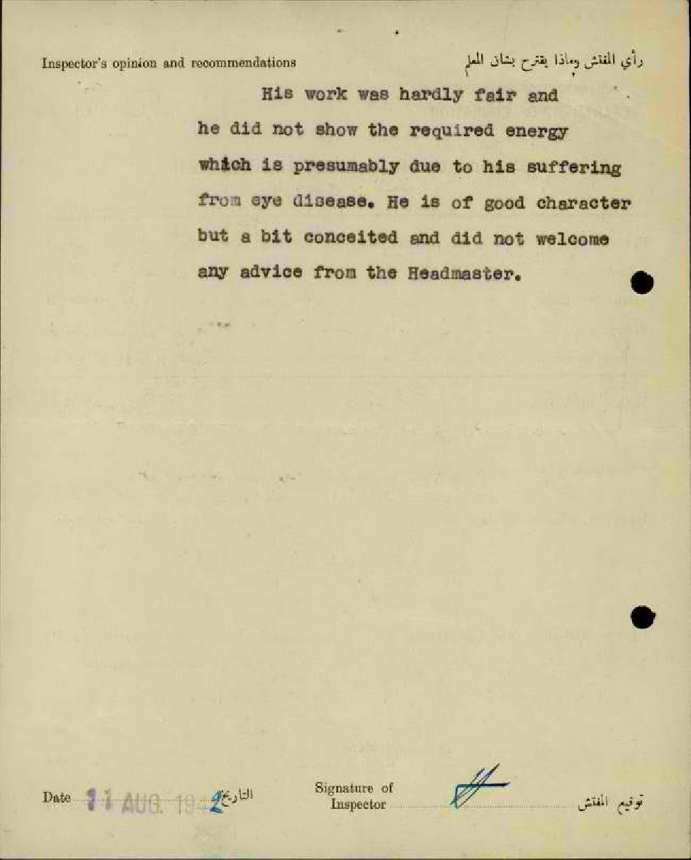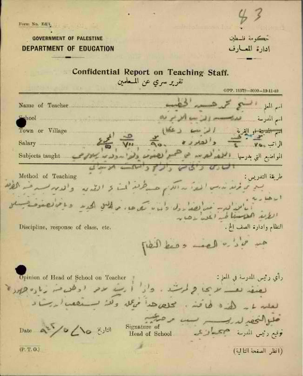 تقرير تفصيلي عن أداء المعلم محمد الخطيب في مدرسة الزيب سنة 1942