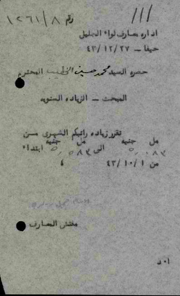رسالة من مفتش المعارف الى المعلم محمد الخطيب بخصوص زيادة راتبه السنوية