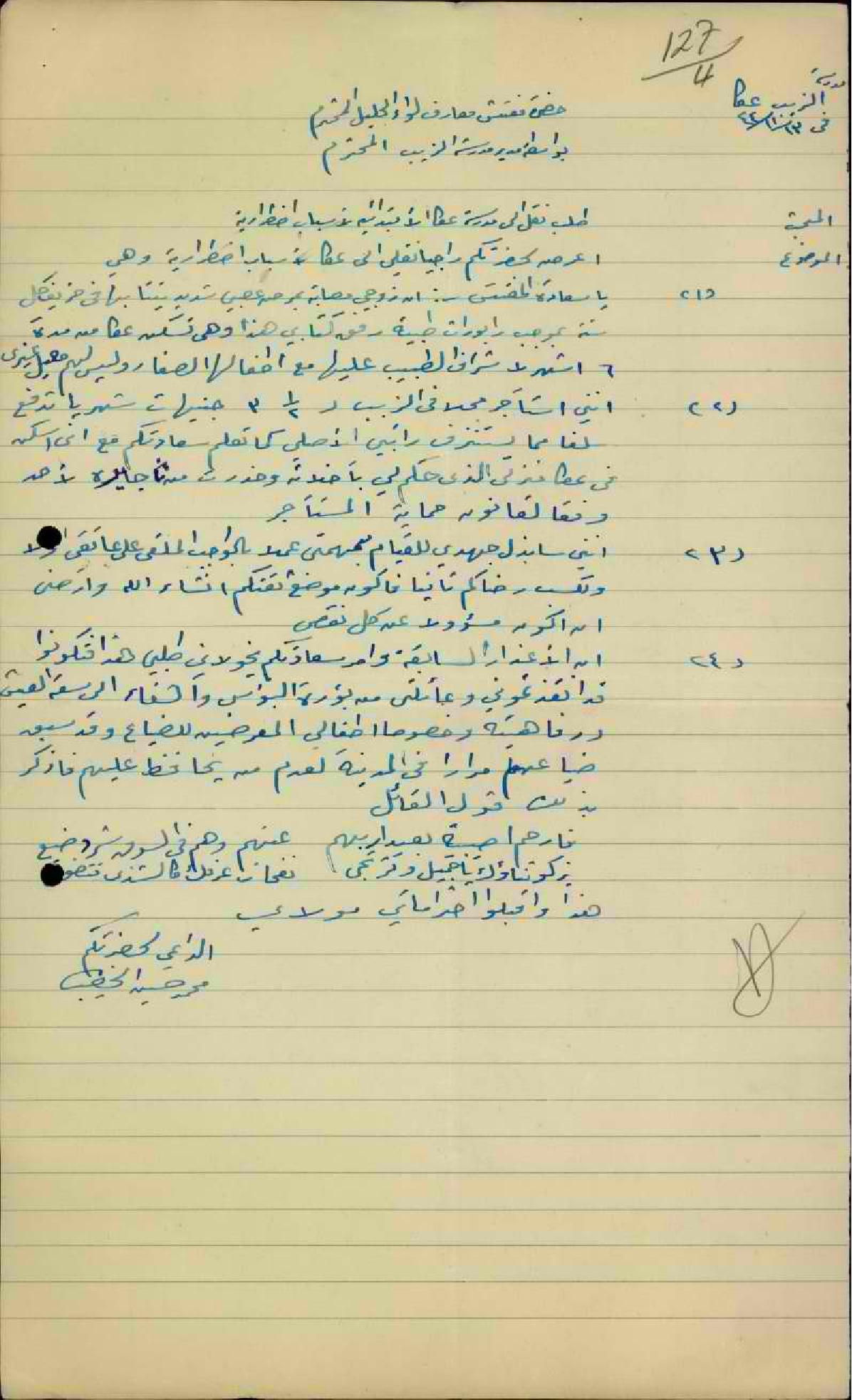 رسالة من المعلم محمد الخطيب الى مفتش المعارف يطلب فيها نقله من مدرسة الزيب الى عكا