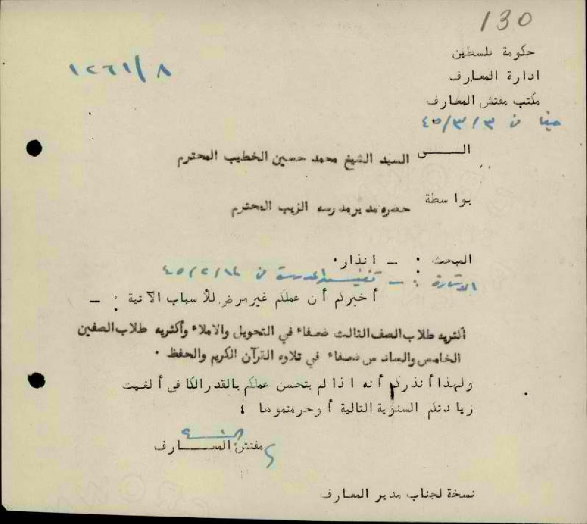 انذار موجه من مفتش المعارف الى المعلم محمد الخطيب لتحسين ادائه