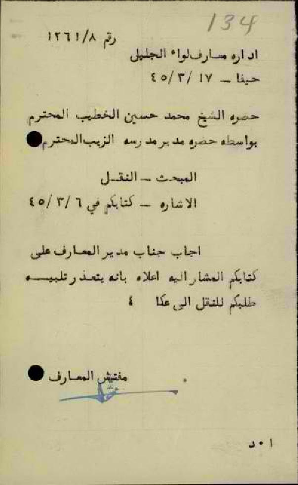 رسالة من مفتش المعارف الى المعلم محمد الخطيب يخبره بعدم امكانية نقله الى عكا