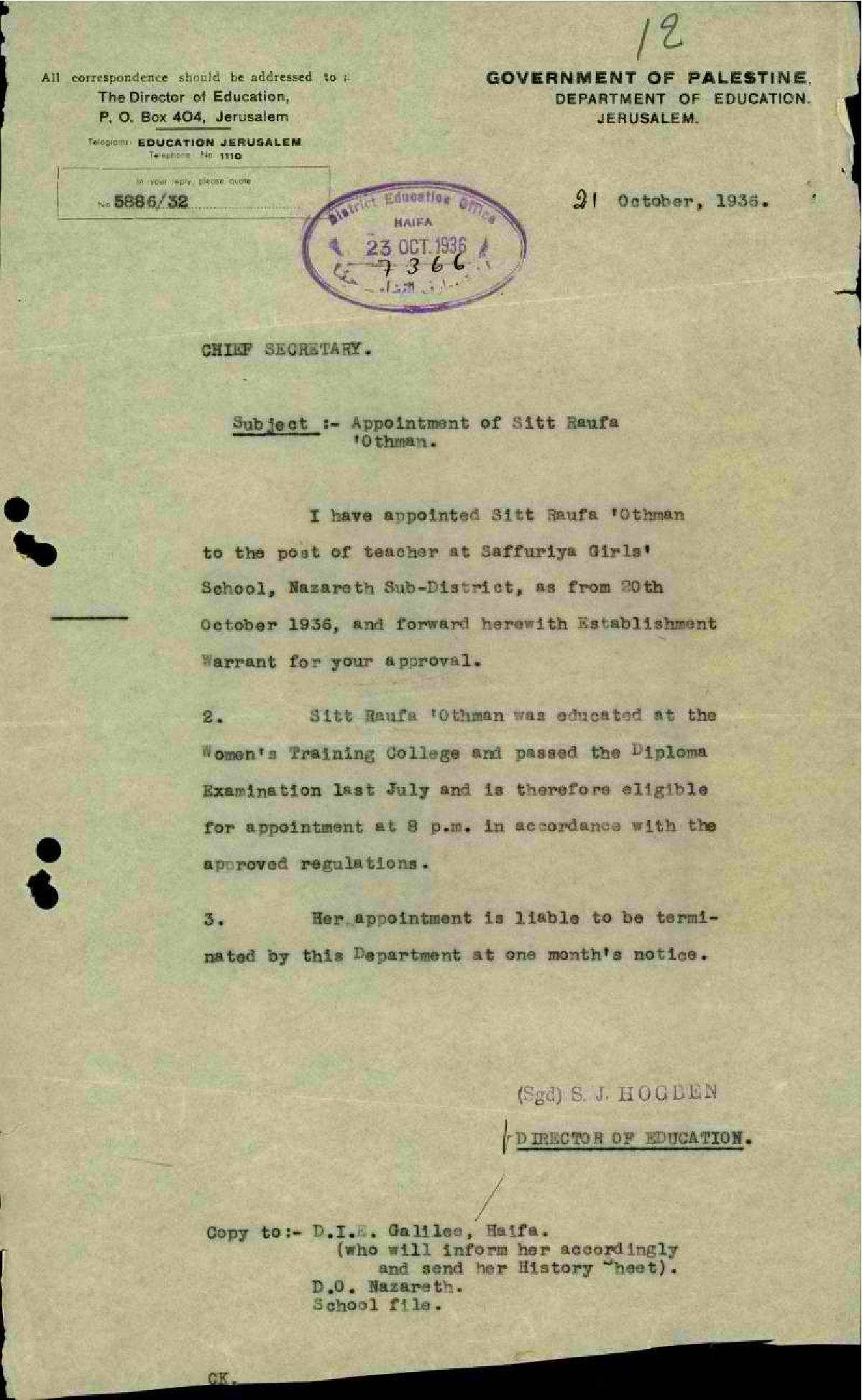 رسالة من مدير المعارف الى رئيس السكرتارية بخصوص تعيين المعلمة رؤوفة عون الله في مدرسة بنات صفورية