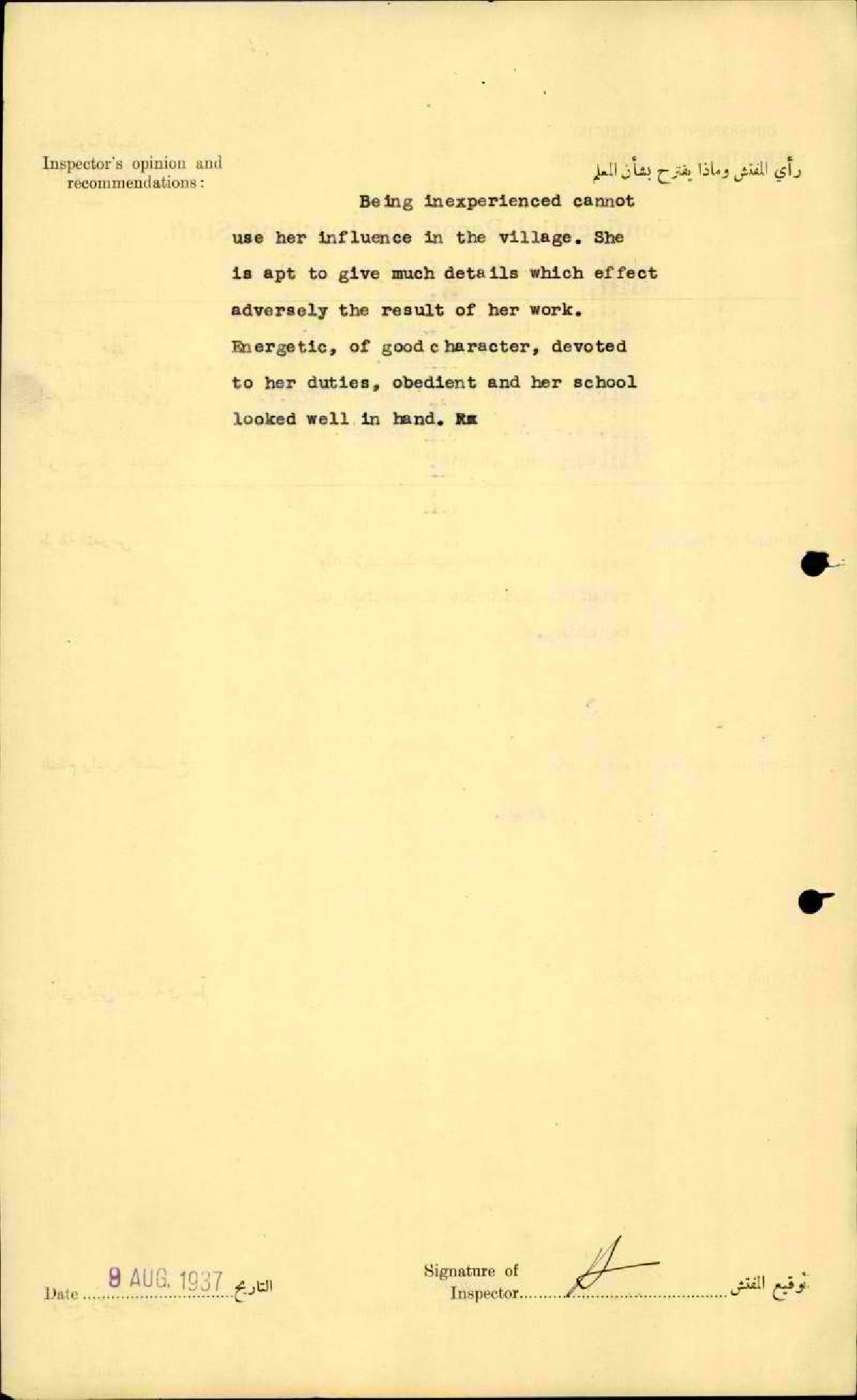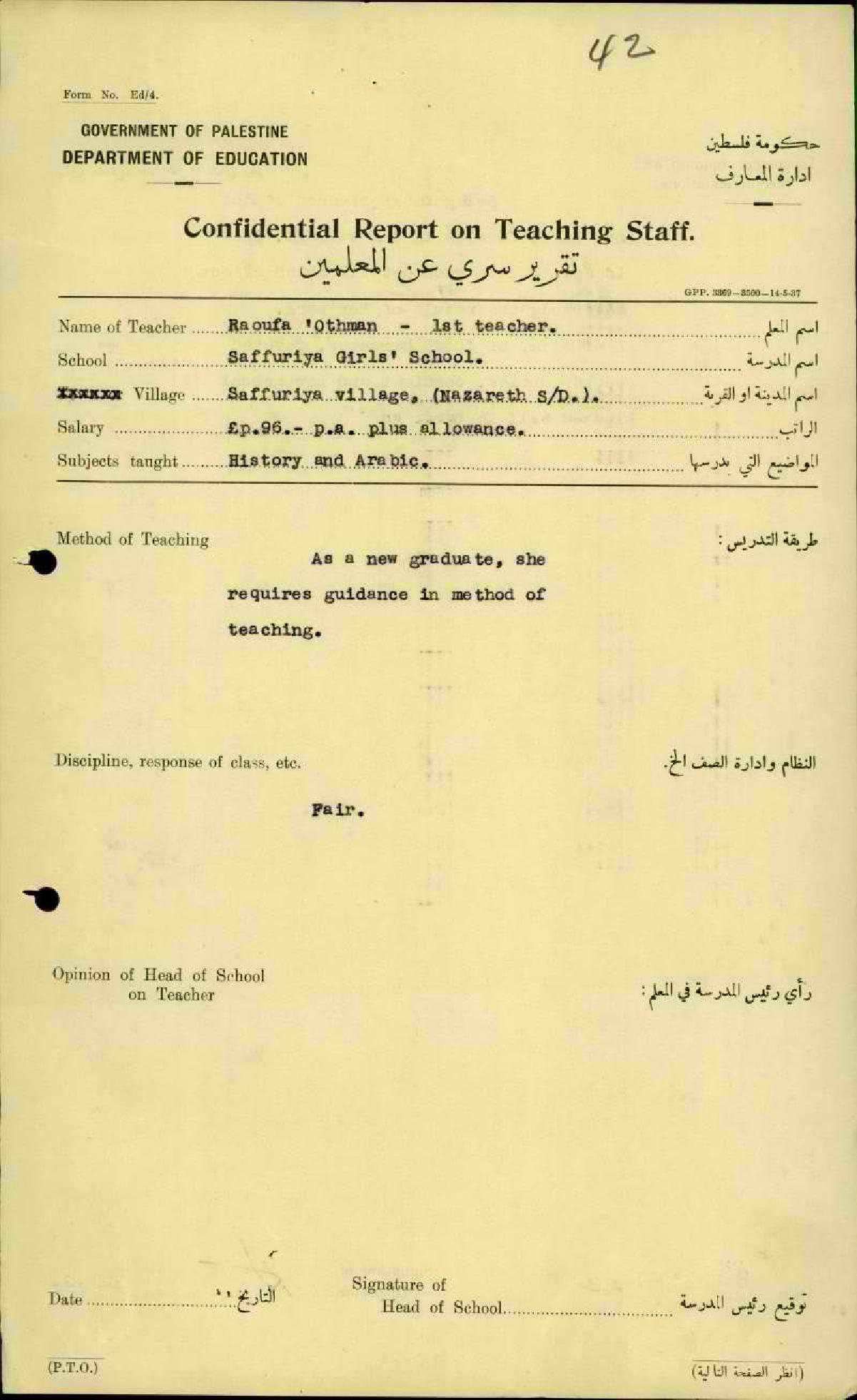 تقرير تفصيلي عن أداء المعلمة رؤوفة عون الله في مدرسة اناث صفورية سنة 1937
