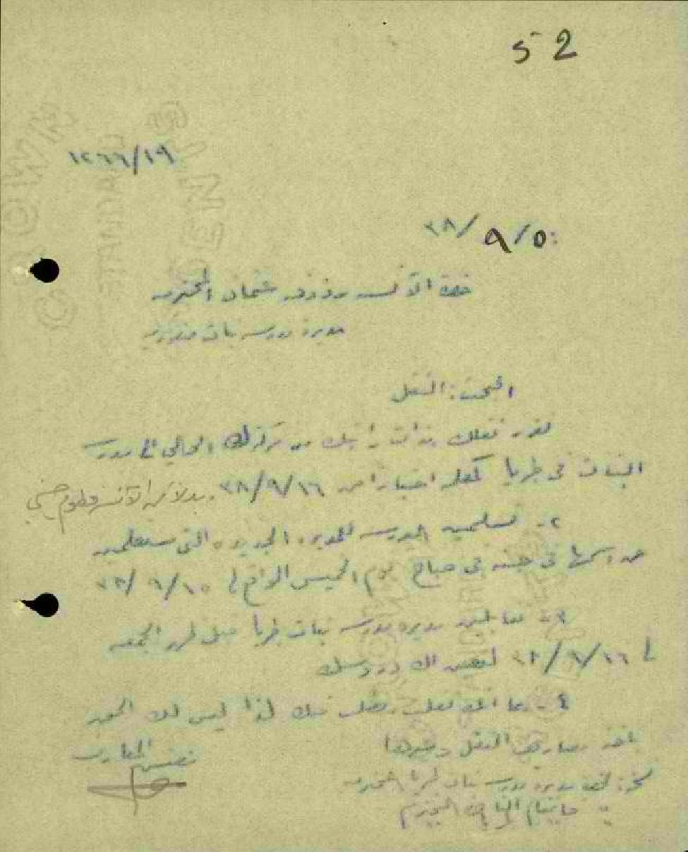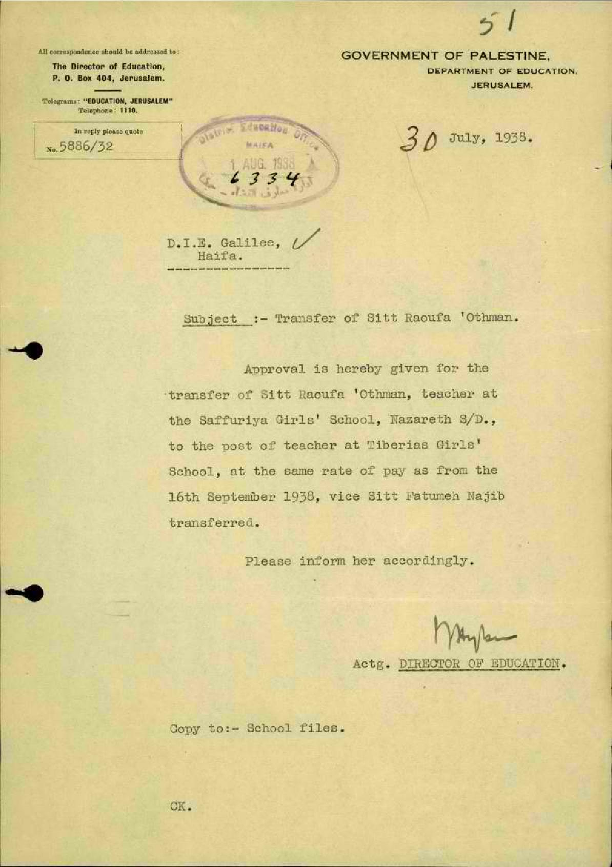 رسائل بخصوص الموافقة على نقل المعلمة رؤوفة عون الله من صفورية الى مدرسة بنات طبريا