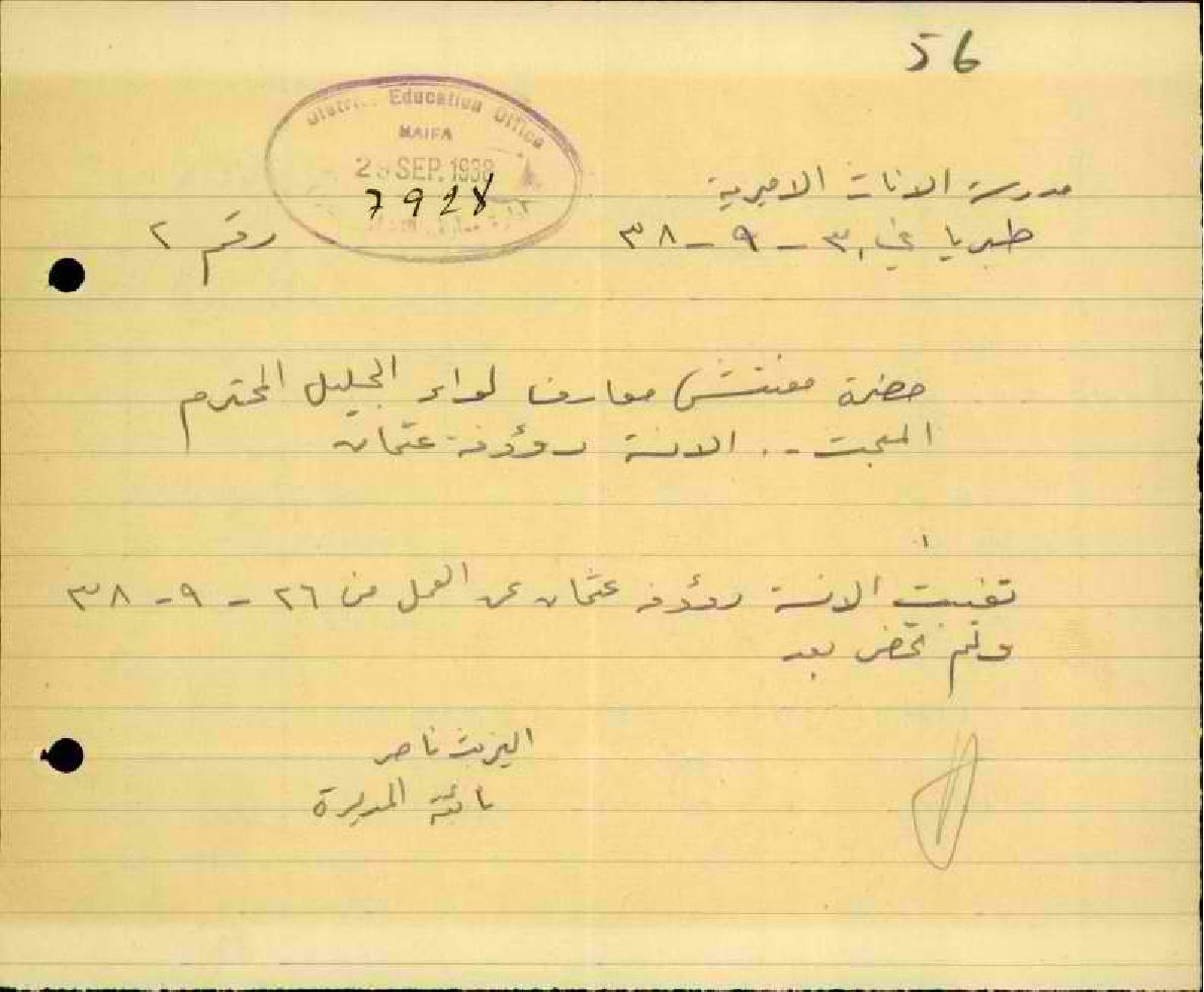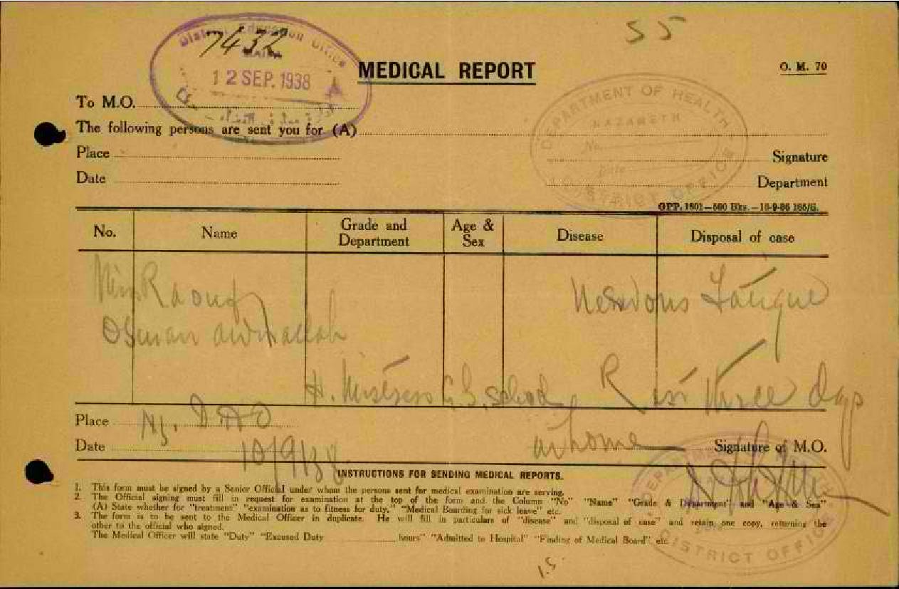رسالة من مديرة مدرسة طبريا الى مفتش المعارف بخصوص تغيب المعلمة رؤوفة عون الله مرفقة بالتقرير الطبي
