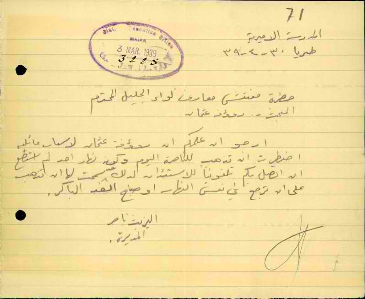 رسالة من مديرة مدرسة طبريا الى مفتش المعارف بخصوص مغادرة المعلمة رؤوفة عون الله للمدرسة لأسباب عائلية