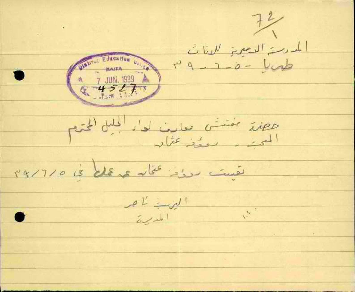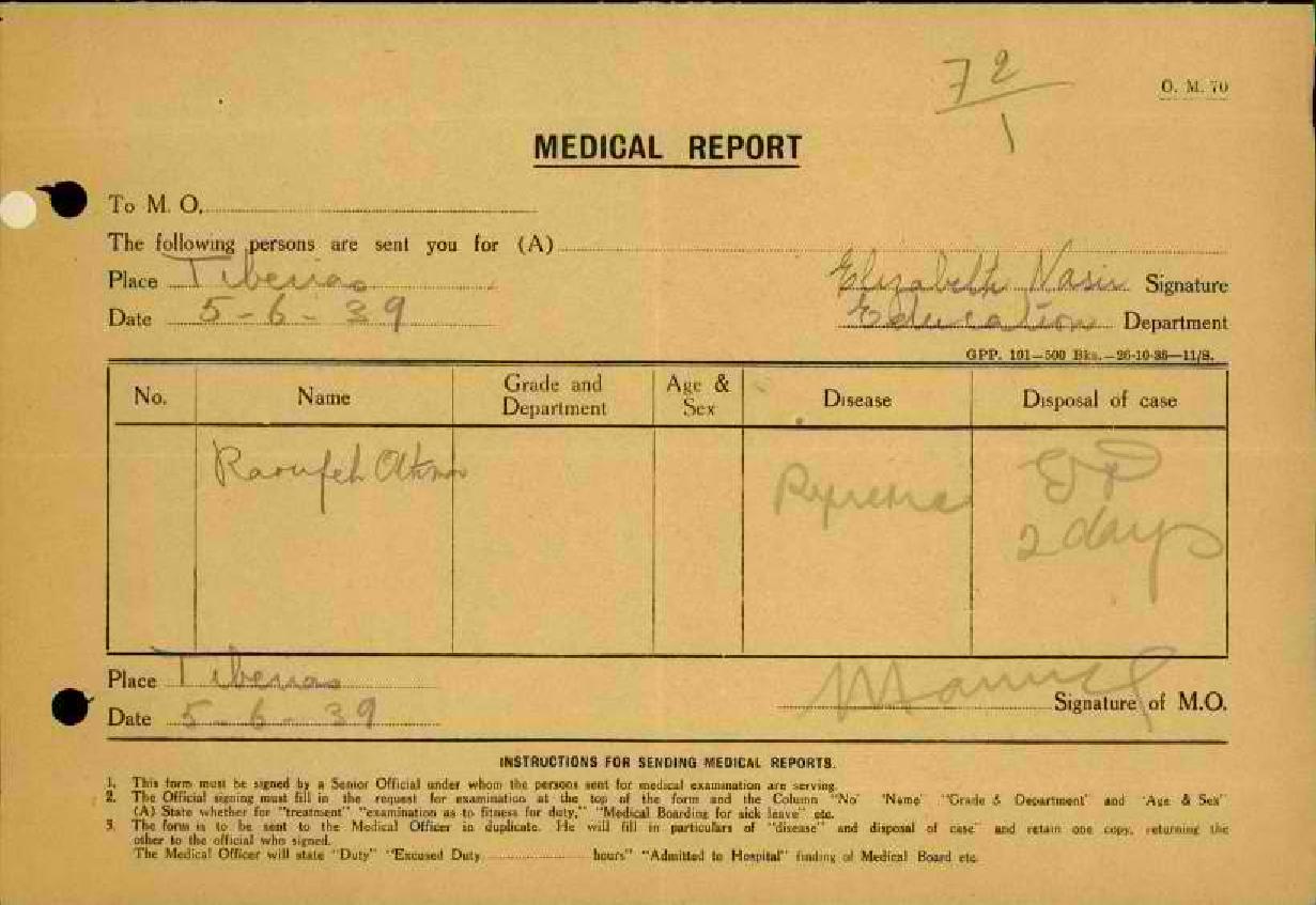 رسالة من مديرة مدرسة طبريا الى مفتش المعارف بخصوص تغيب المعلمة رؤوفة عون الله مرفقة بالتقرير الطبي