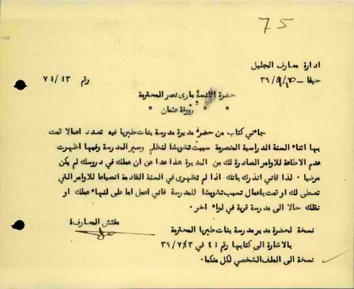 رسالة من مفتش المعارف الى المعلمة رؤوفة عون الله بخصوص أدائها الغير مرضي