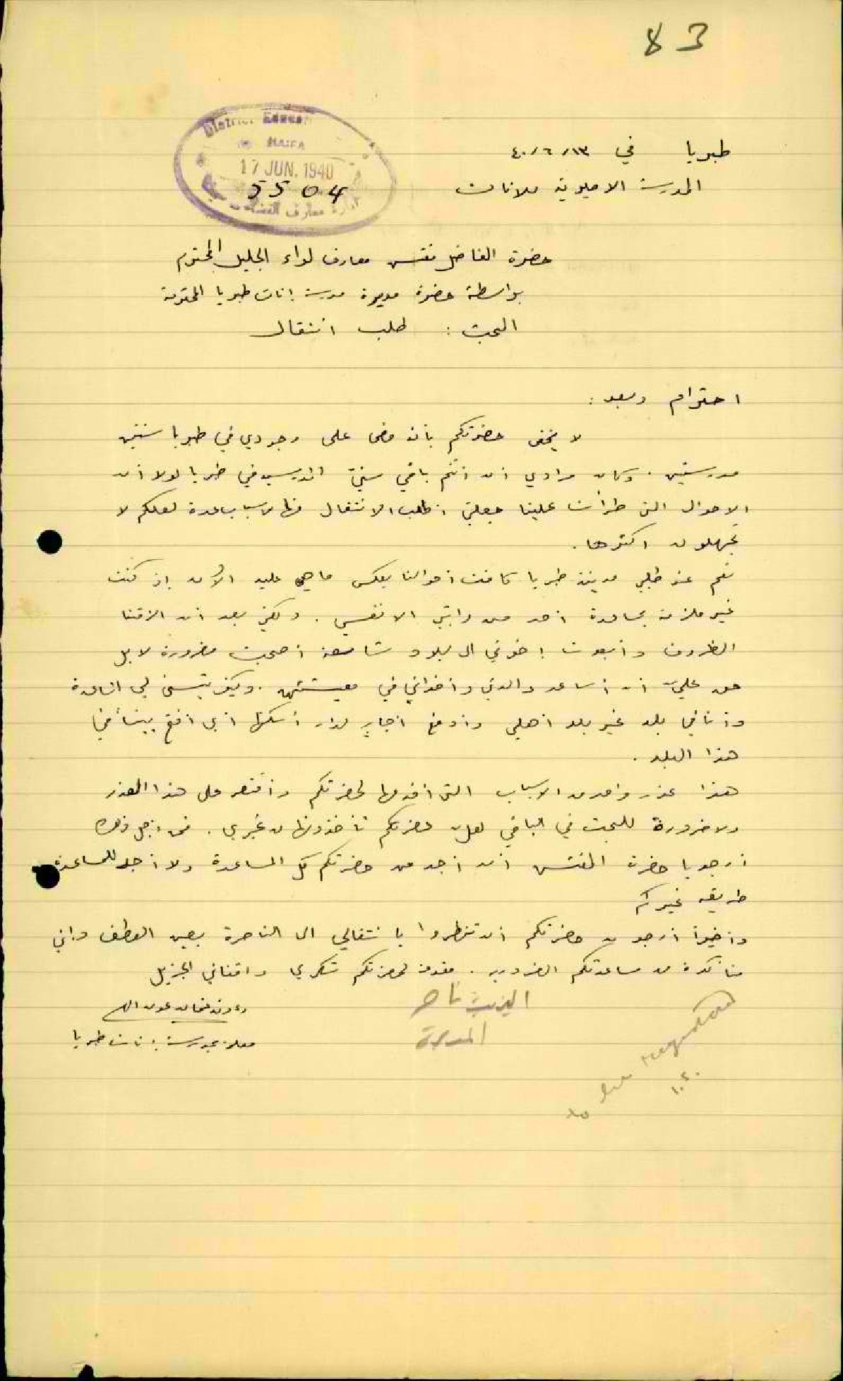 رسالة من المعلمة رؤوفة عون الله الى مفتش المعارف تطلب فيها نقلها من مدرسة اناث طبريا