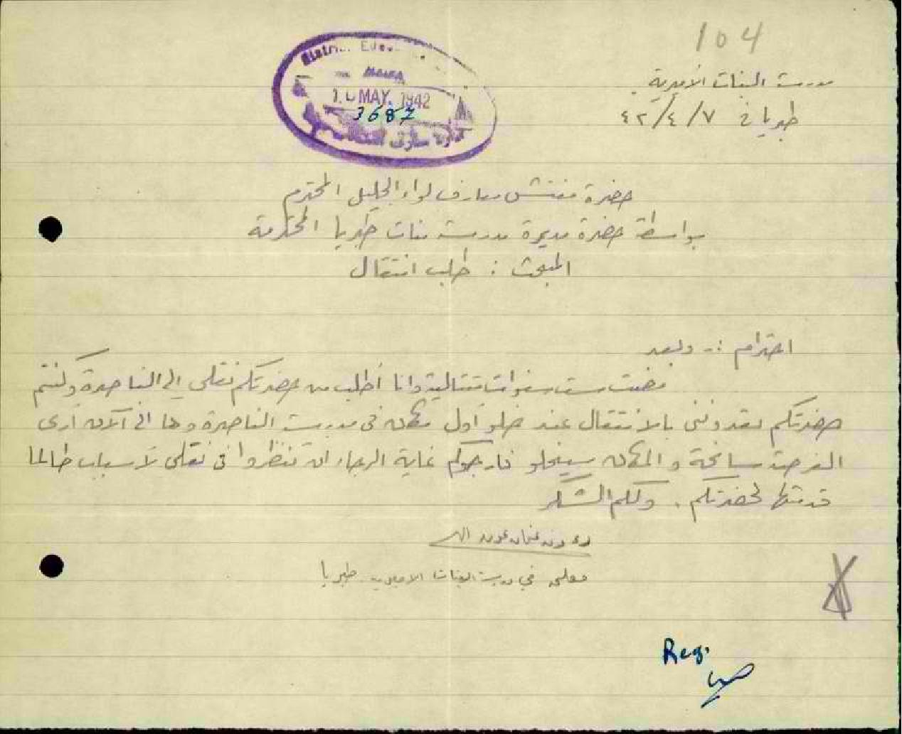 رسالة من المعلمة رؤوفة عون الله الى مفتش المعارف تطلب فيها نقلها من مدرسة اناث طبريا الى الناصرة