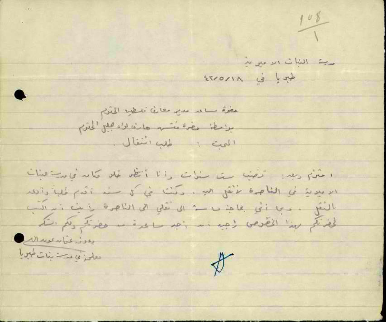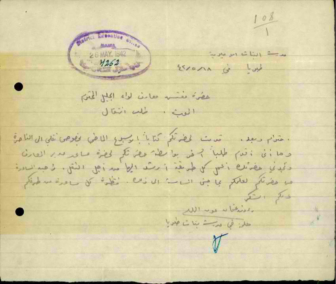 رسائل من المعلمة رؤوفة عون الله الى مفتش المعارف تطلب فيها نقلها من مدرسة طبريا الى الناصرة