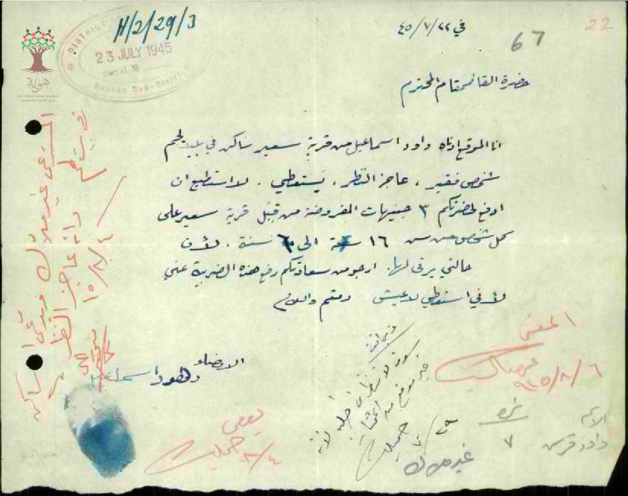 رسالة من داوود اسماعيل إلى قائمقام قضاء الخليل يطلب اعفائه من ضريبة مصلحة القرية بسبب فقر الحال