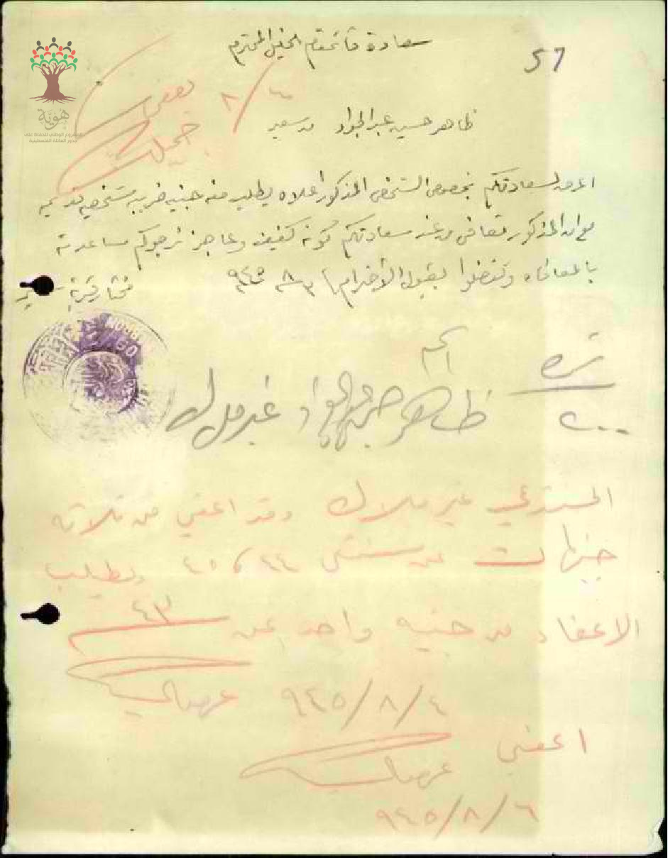 رسالة من مختار قرية سعير إلى قائمقام قضاء الخليل بخصوص ظاهر حسين عبد الجواد يطلب اعفائه من ضريبة مصلحة القرية لأنه كفيف وفقير الحال
