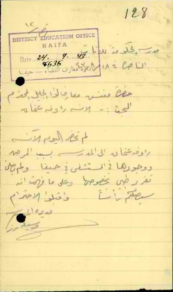 رسالة من مديرة مدرسة الناصرة الى مفتش المعارف بخصوص تغيب المعلمة رؤوفة وعن الله بسبب المرض